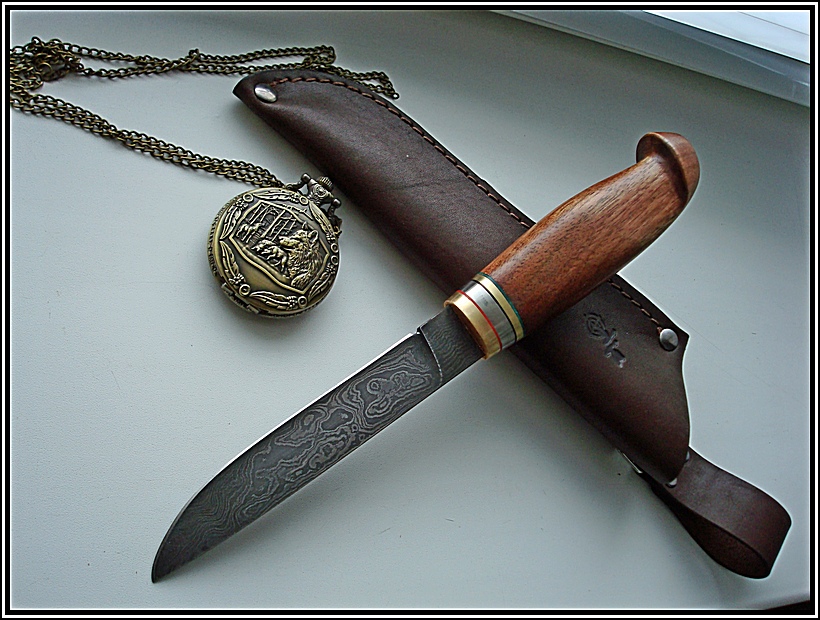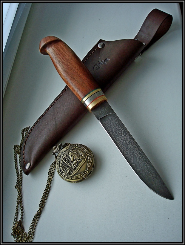 Клинок дамаск ХВГ.5ХНМ. У8А . твердость 60- HRC.Длина клинка 130мм, ширина с 22 мм, толщина с 4мм на клин.,больстер латунь и нерж сталь.Материал рукояти дерево Кавказкий орех.Пропитка "Даниш Оил".Чехол кожа. цена 2500 грн По всем вопросам прошу звонить или писать в "Вайбер". 0505648882
