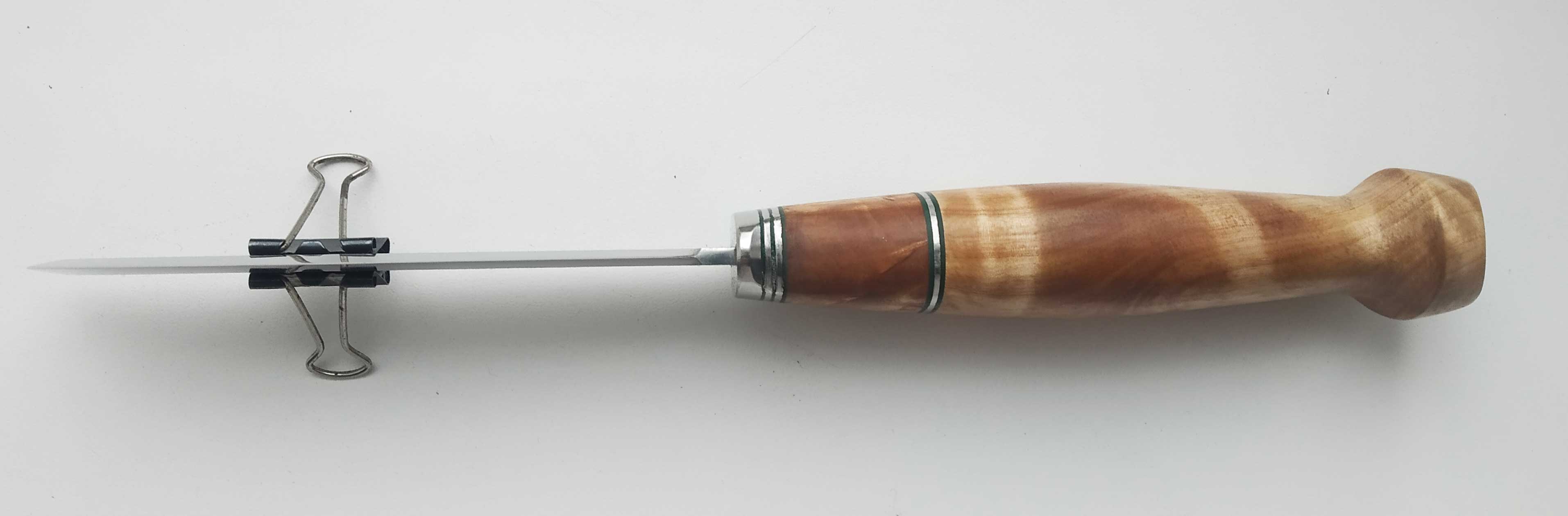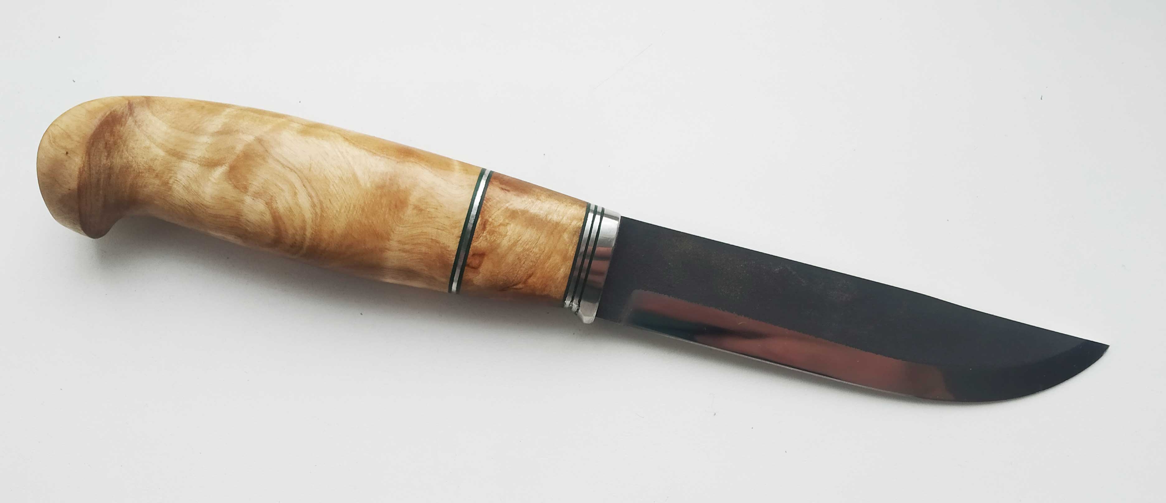 Cт.n690, 113 х 115 х 23 мм,толщина в обухе 2,7 мм, больстер из нержавейки и зеленной фибры, рукоять вставка из карельской березы, сувель березы. Клинок нежавеющий. Ножен нет. Цена 2500 гр.