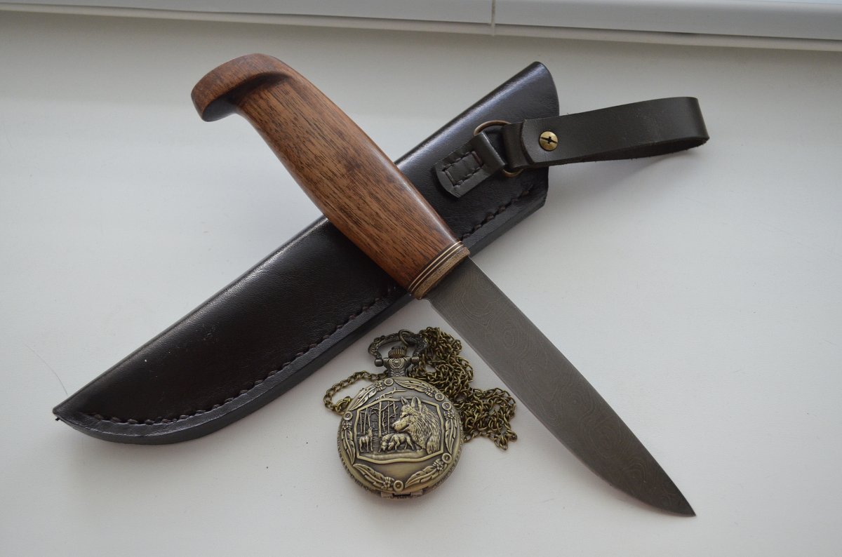 Финка.Дамаск 320 слоев,ХВГ+ ШХ 15. Длина клинка 125мм, ширина с 23мм.Сведена в 0.2мм.Рукоять твердый Африканский экзот. Чехол кожа.