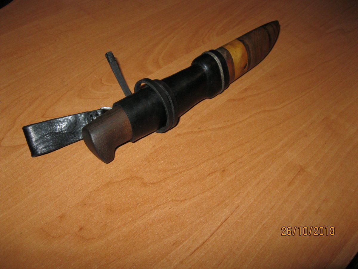 финочка.сталь 95Х18 длина лезвия 104 мм,ширина 20 мм,толщина 3 мм.общая длина ножа 220 мм.сведён в 0,2 мм,заточена.рукоять наборная-дерево.ножны наборные-дерево,кожа.свободный подвес. 1000 гр.