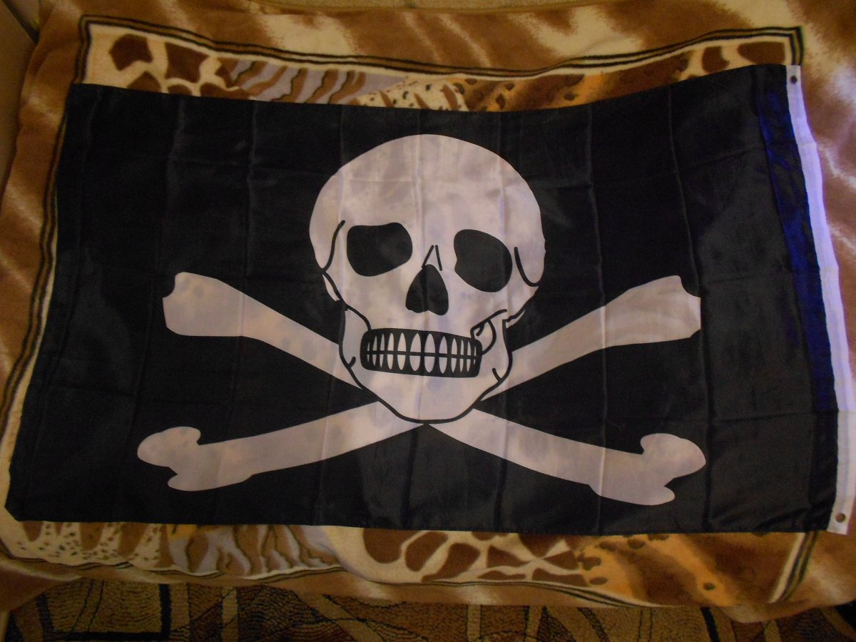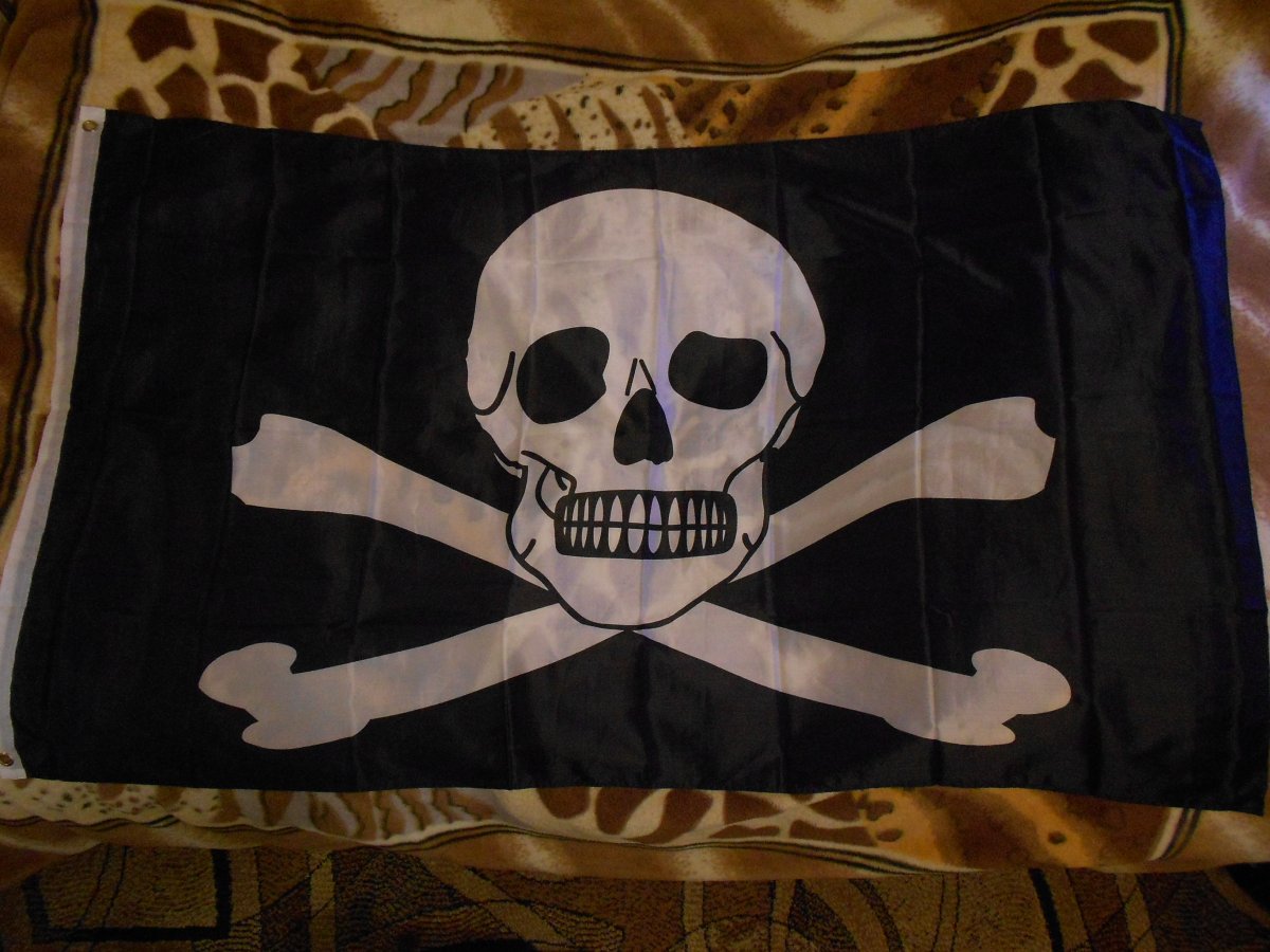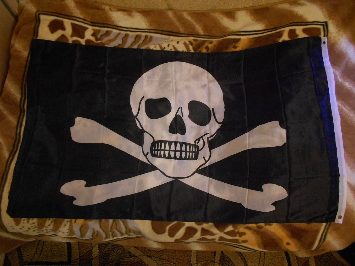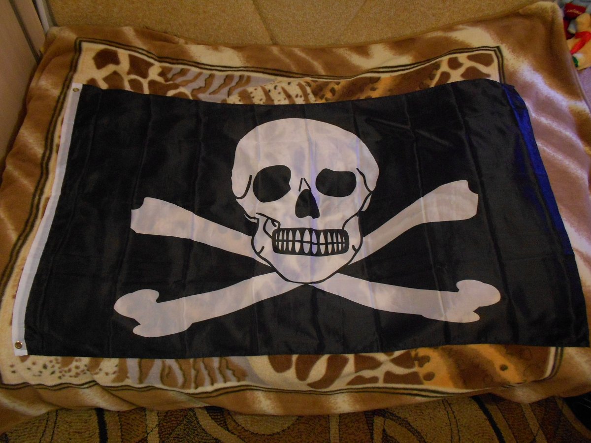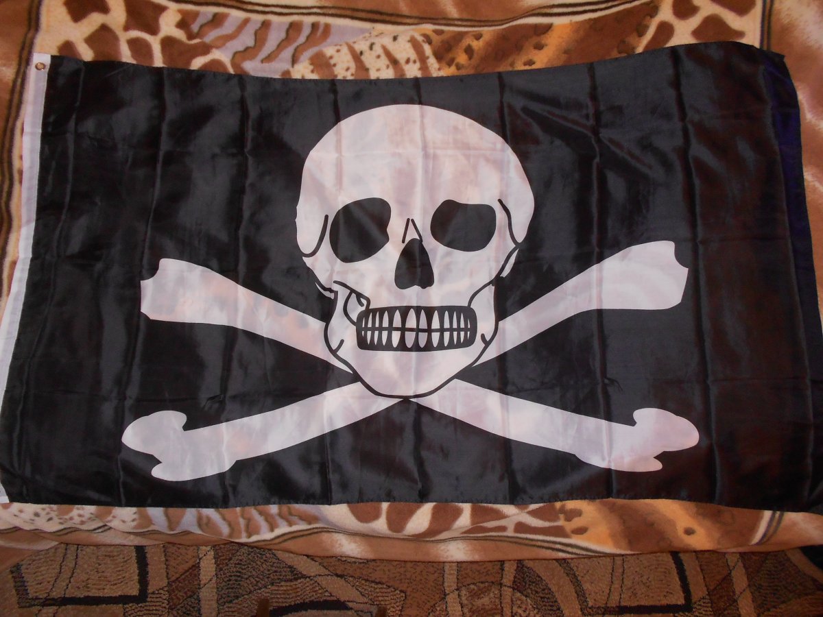 Лот №6 Флаг " Весёлый Роджер ".Новый. Полиэстер 100%. Рисунок двухсторонний. Размер 90 см на 150 см. Вопросы и предложения в лиску. Резерв в теме. Цена 320 гр.