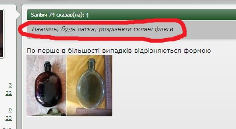 Починаю спочатку. Людина попросила "Навчить, будь ласка, розрізняти скляні фляги...", я навів самий простий приклад як відрізнити флягу РІА від РСЧА. Мені радянську флягу не можна виставити для порівняння а вам німецьку та австрійську можна,так виходить? Я не обурююсь а веду дискусію! На цьому в мене все!