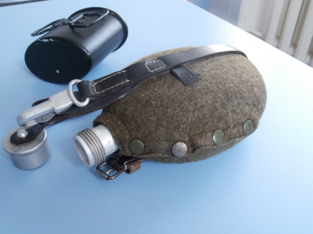 Фляга вермахт. Стаканчик новодел, обвес и чехол я так понимаю тоже. Карабин оригинальный. Все на фото. Сколько может стоить? С уважением!