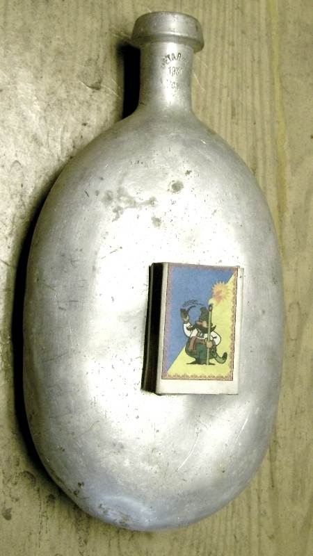 ...А-пу-пе-е-е-ть!!! Купил я её у одной бабушки вместе со старыми австрийскими весами с маленькими клеймёнными гирьками, литровой бронзовой или латунной кружкой для керосина (СССР, 46-й год) и двумя большими колокольчиками: один аллюминиевый, а второй бронзовый - "ДАР ВАЛДАЯ КОГО ЛЮБЛЮ ТОГО ДАРЮ"... Это я к тому, что именно флягу я оценил дешевле всего (я сам называл ей цены от фонаря). Надо бы ещё разок смотаться к ней на чердачёк. Он там весь завален всяким хламом. И как можно скорее, а то не ровён час.........