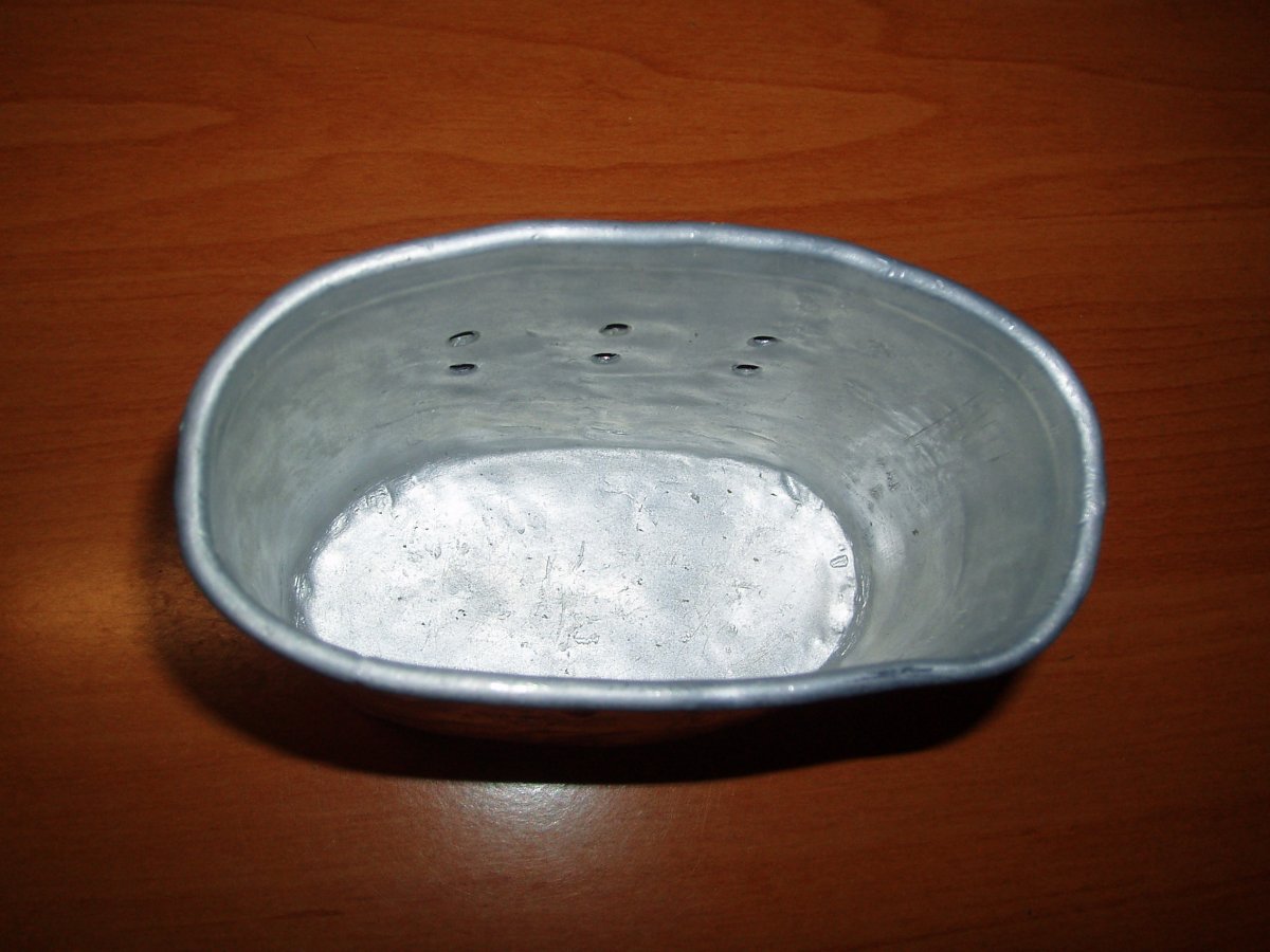 Загорелся когда-то флягой и началось все со стакана (манерки). Приобрел здесь на форуме, пару убитых стаканов. Один был в дырах, но с креплением для ручек, другой был получше, но с порезом, погнут и без крепления. Сначала срезал заклепки и отсоединил и выровнял крепление ручек и скобы ремня. После почистил с помощью средства для чистки засоров "крот" одну из кружек. Алюминий чистит оно очень хорошо. Вырезал деревяшку по форме кружки и с ее помощью произвел рихтовку. Изготовил по чертежам Юргена ручки из проволоки 3.5мм. Затем сделал из проволоки заклепки и с помощью штыря для формовки головок заклепок все приклепал.