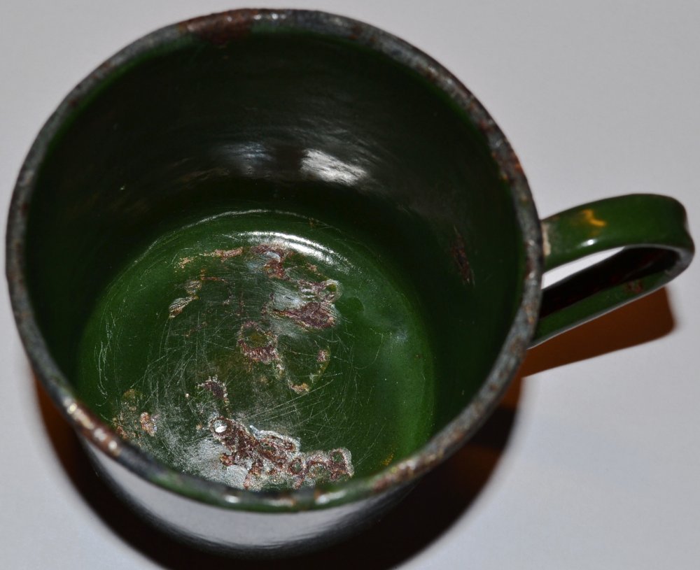 Лот №9 - Кружка, эмалированная - продан, в продаже остались: Лот №8 - Кружка, эмалированная, не мятая, читается клеймо, не течёт, есть несколько не больших сколов снаружи и внутри, можно использовать по назначению. Цена 30,00грн.+дорога.