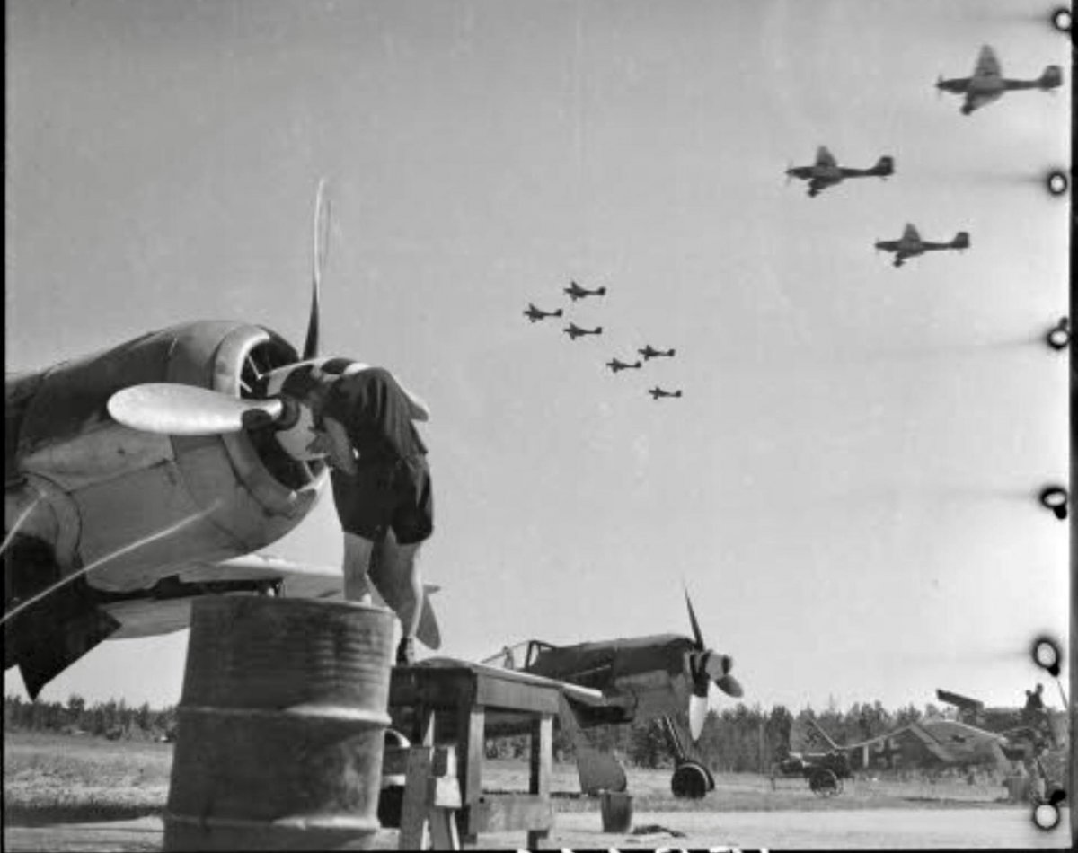 Механик ставит колпак обтекателя на А-6 под пролетающими штуками. Gefechtsverband Kuhlmey, аэродром Иммола, 2 июля 1944
