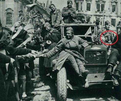 Стало известно имя автора снимка который был размещён в постах #27,#30 и #88,где взвод разведки,это Александр Капустянский,фото сделано 2 мая 1945 года.Эту и фотографию артиста Алексея Смирнова из поста #52 уже разукрасили: