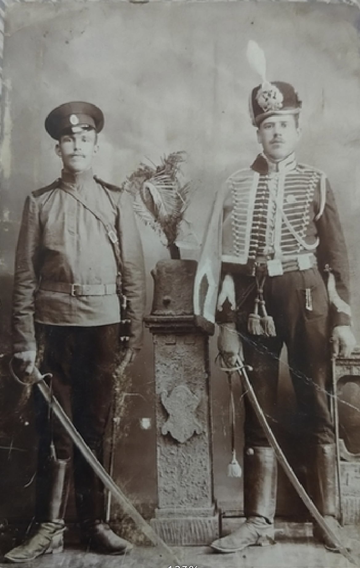 Вам тоже здоровья. Если имете ввиду персонажа справа .то такого покроя формы уже не носили в те времена когда делалось фото. Головной убор похож на настоящий начала ХХ века а вот остальное ? Позже выложу ка к действительно выглядели гусары РИА уже в ХХ вв.