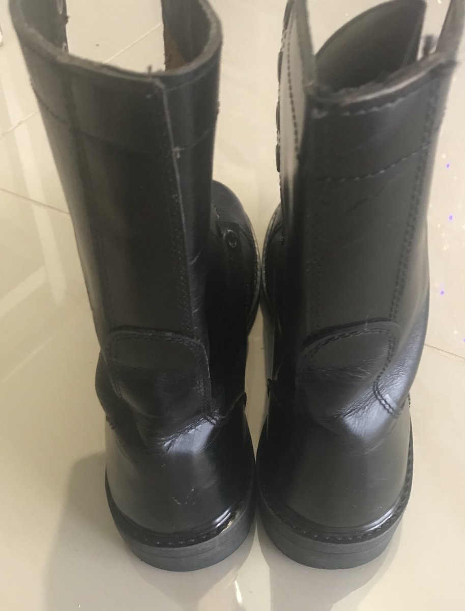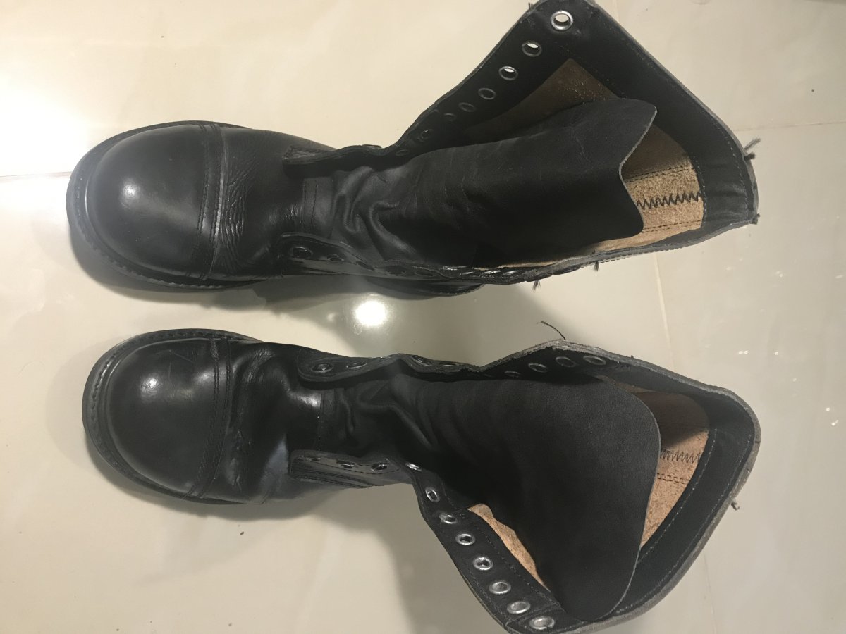 Фото педалей. На внутренней стороне вверху есть какой-то штамп,но не читается,больше никаких надписей нет и не было,стелек тоже не было изначально,43 размер ноги чувствует себя комфортно,полнота средняя. Натуральная кожа,возможно бизон или какой-то другой толстошкурый бык был донором для обувки. Подошва пристрочена к верху,каблук прибит гвоздями к подошве,язык до пятого шнуркового кольца составляет одно целое,типа антилужа. Так как это было всё комплектом с формой,принадлежность к стране вроде сомнений не вызывает больше,интересует цена в таком состоянии,немного б/у,не кремились,только помыты. Буду признателен за оценку как берц отдельно,так и всего комплекта полностью,как на первом фото в теме. С уважением.