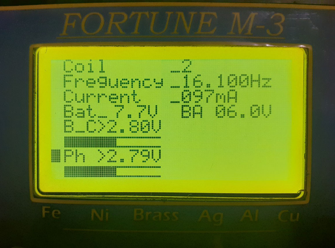 ...и еще вопрос в догонку...почему когда баланс катушки выключен - он 0.62V. Включение баланса датчика вообще ничего не дает. Вообще. Аппарат (сам МД) возможно не умеет балансить эту катушку? Т.к. на большой - все работает же! ...проверил как звучат монеты - так звучат вроде нормально. В своих диапазонах. Феррит на -90. Потом захожу в грунт баланс, делаю с 00 на +01 и он уже на -93-94 звучит. Сохраняю. Феррит звучит, но цифры не показывает ...а монеты вроде как обычно. 83-84 медь. Около 75 серебро. 65 алюминий, алюминиевая бронза, латунь Украины 50 коп. Около 55 латунь поменьше советская. 45 еще поменьше советская, 1 копейка. 40 - мельхиор. 30-35 нейзильбер. Это по воздуху. Вроде показывает все адекватно. ...сколько не мучил (уже получалось и на других частотах настроить, типа 15.990 к примеру) - но видит феррит исключительно на -90. Повышаешь частоту - сползает в диапазон -80-90. Понижаешь - непонятная вакханалия. Сигналов почти нет, но прыгает разбаланс. А вот при -90 в грунт балансе когда +01 ставишь - все вроде ок. ХЗ короче... ...пойду завтра все равно в поле, а что делать ...дальность по воздуху, кстати вроде и норм. Точно не мерял, но - не мало. Прилично. Ну и сигналы вроде "прозрачно" показывает