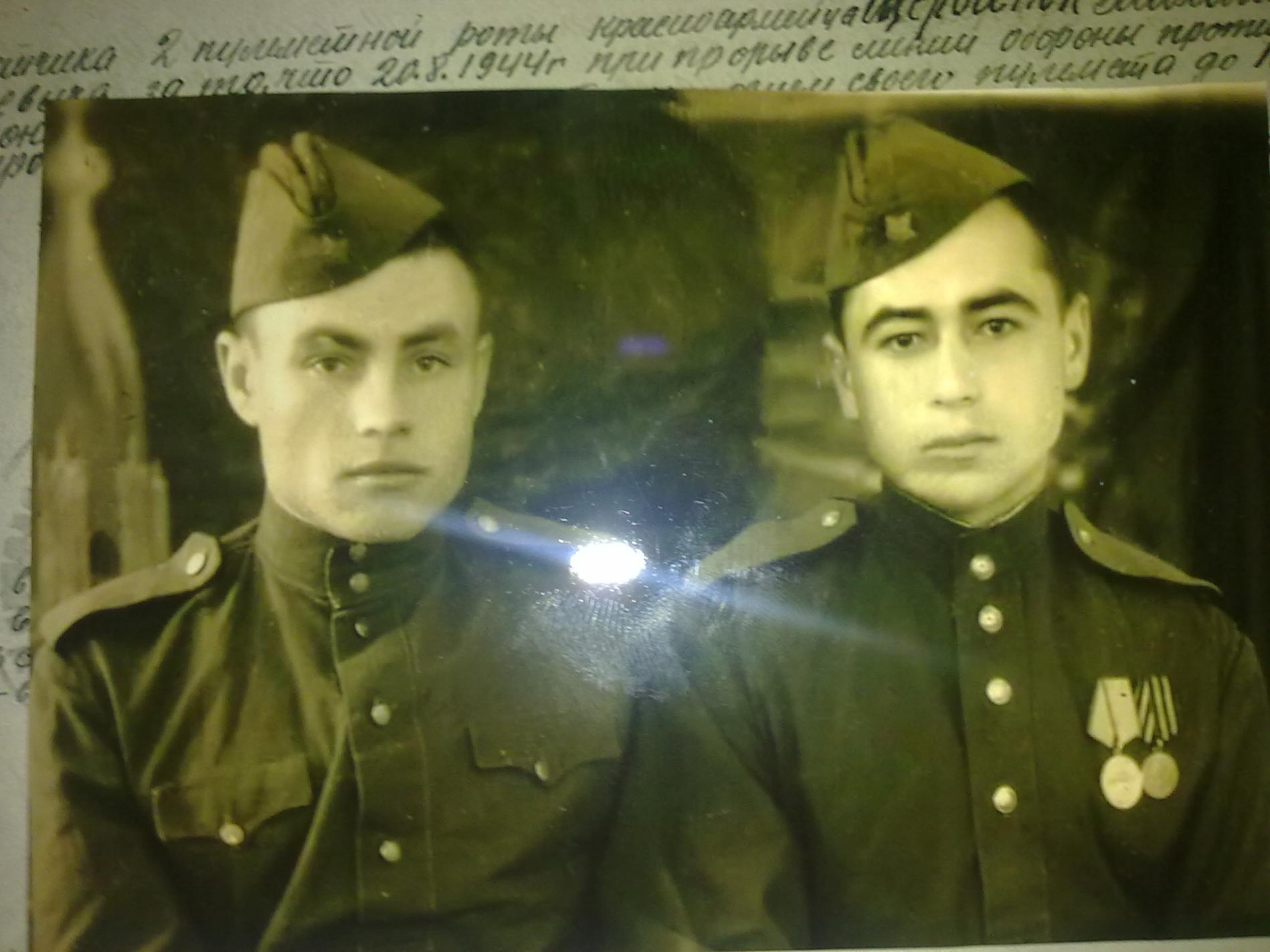 я думаю на солдате с медалями солдатская гимнастёрка обр.1943г. без карманов. пуговицы он "пришпандорил" туда очевидно от погон для "эффекта". на солдате слева офицерская гимнастёрка с карманами, что однако разрешалось носить рядовому составу, если гимнастёрка была уже в употреблении, т.е. не новая. поэтому нарушение устава самое минимальное только с этими "пугами" от погон.