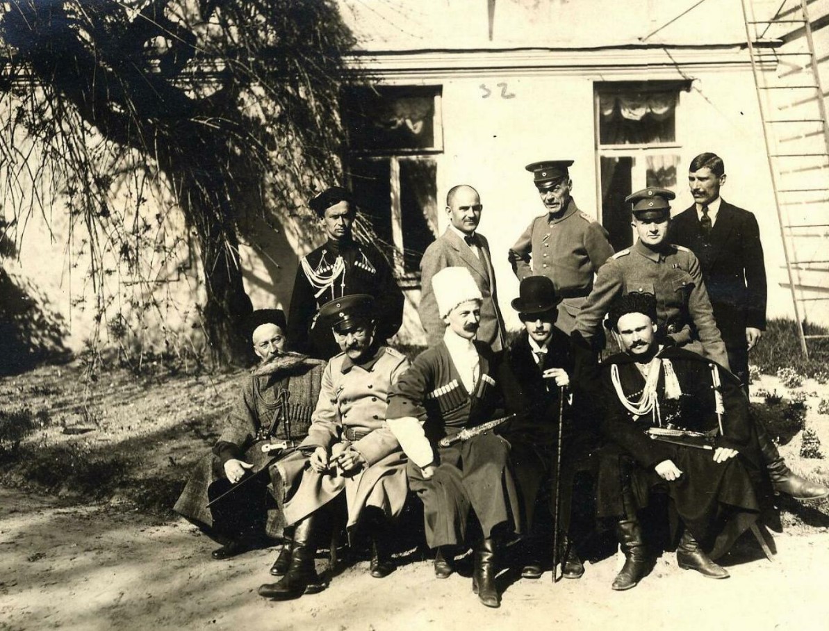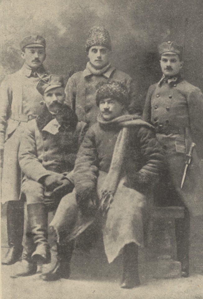 Представники Армії УНР серед старшин УГА на Святі Злуки в Коломиї, січень 1919 року. Сидять від ліва: галичанин сотник Іван Цяпка і надніпрянець полковник Борис Ревуцький. Стоять: невідомий старшина, полковник Микола Чеботарів (полтавчанин) і четар д-р Ілько Цьокан (галичанин).