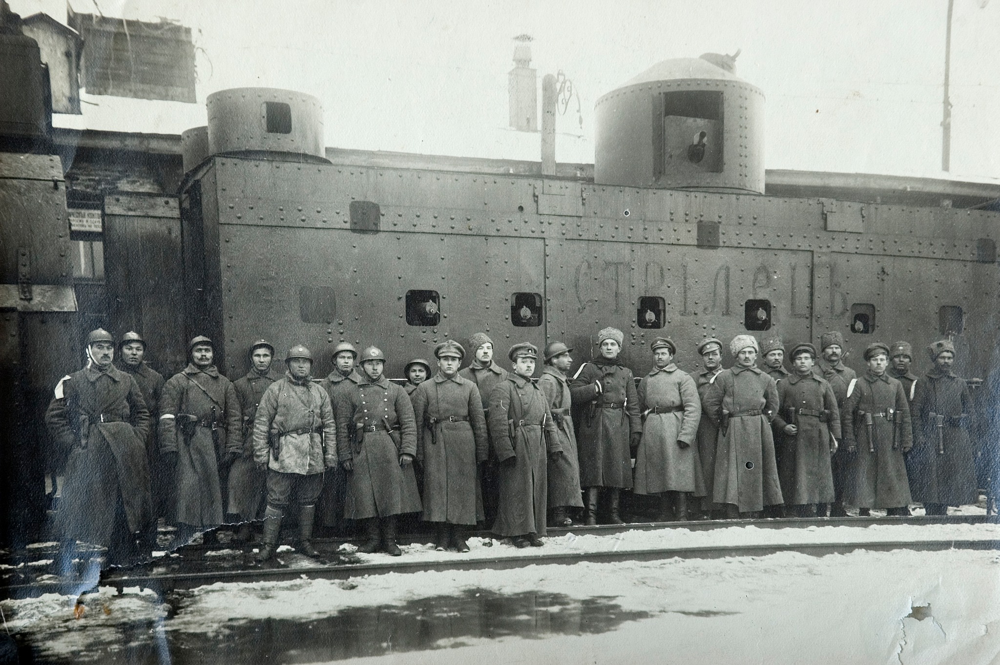 Команда панцерника «Січовий Стрілець» після здобуття Києва, кінець 1918 — початок 1919 року. Панцирний потяг «Січовий Стрілець» — колишній російський панцирний потяг №4 конструкції інженера Балля. З грудня 1917 року перебував на ремонті в Одесі. У 1918 році перебував на озброєнні армії Української Держави. Наприкінці листопада того ж року під Фастовим захоплений військами Директорії в офіцерських дружин, які боронили владу гетьмана. Потому потяг було передано командуванню Осадного корпусу та названо «Січовий Стрілець». Як згадував очевидець, у той час панцирний потяг був озброєний однією гарматою та «десятком кулеметів». Його команду складали гарматники з Гарматної бригади Січових Стрільців. Командиром став хорунжий О. Вудкевич, командирами кулеметних відділень — чотарі В. Глова та Грицюк. На початку січня 1919 р. панцирний потяг змінив назву на «Стрілець» — у зв’язку із появою в складі Осадного корпусу панцерника «Січовий».