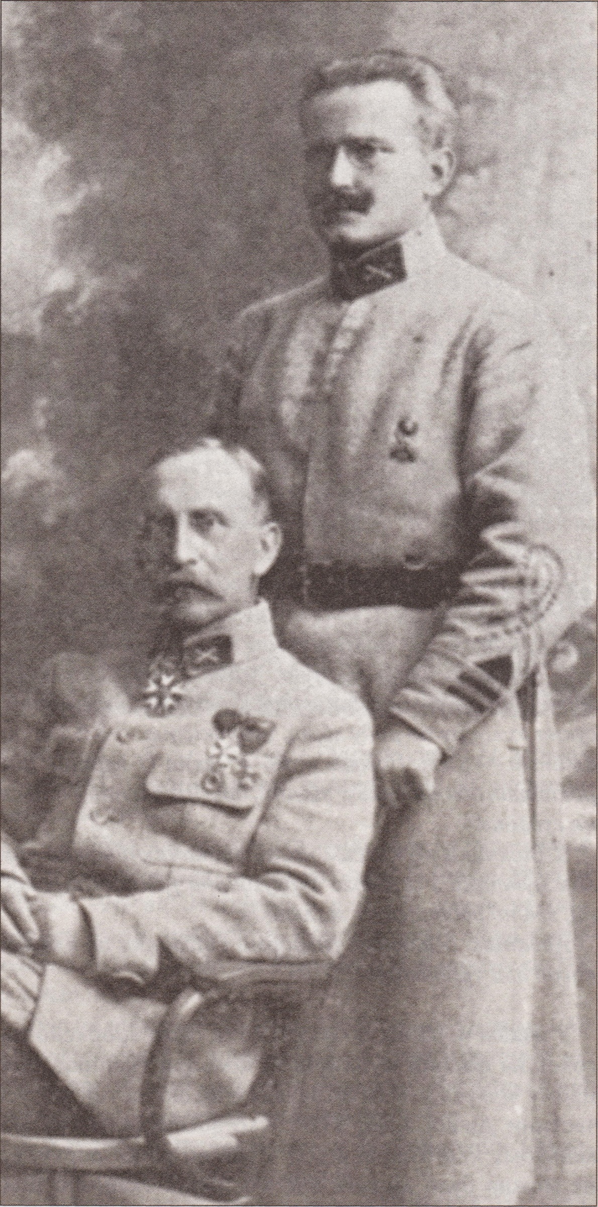 Повноважний представник Української Народної Республіки в Румунії генерал С. Дельвіг (сидить) та його помічник — полковник О. Ковальський. Обидва одягнуті в уніформу з відзнаками по посадах (на рукавах) та родах зброї (червоні петлиці зі знаками гармат) відповідно до наказу Ч. 276 від 24.04.1919 р. На полковнику — «шинель сірого сукна покрою чумарки». Фото з альбому «Geroiska Ukraina», виданого в Канаді в 1920р.