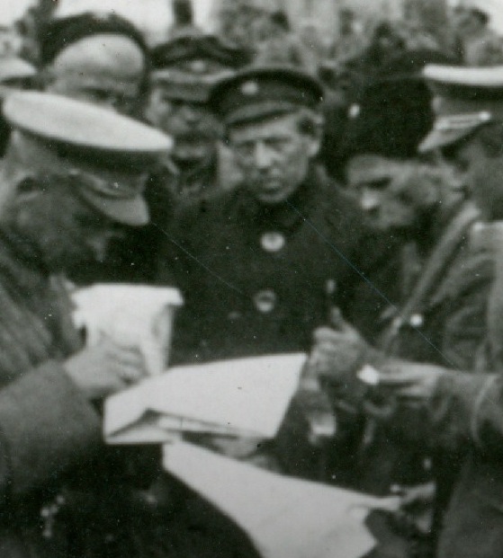 Воєнна нарада на ринку в Ярмолинцях на шляху Проскурів — Кам'янець-Подільський. Осінь 1919 року. На світлині: Петро Дяченко (з голеною головою), в центрі — Симон Петлюра, за ним ад'ютант Олександр Доценко, праворуч від Петлюри генерали Михайло Омелянович-Павленко і Олександр Удовиченко