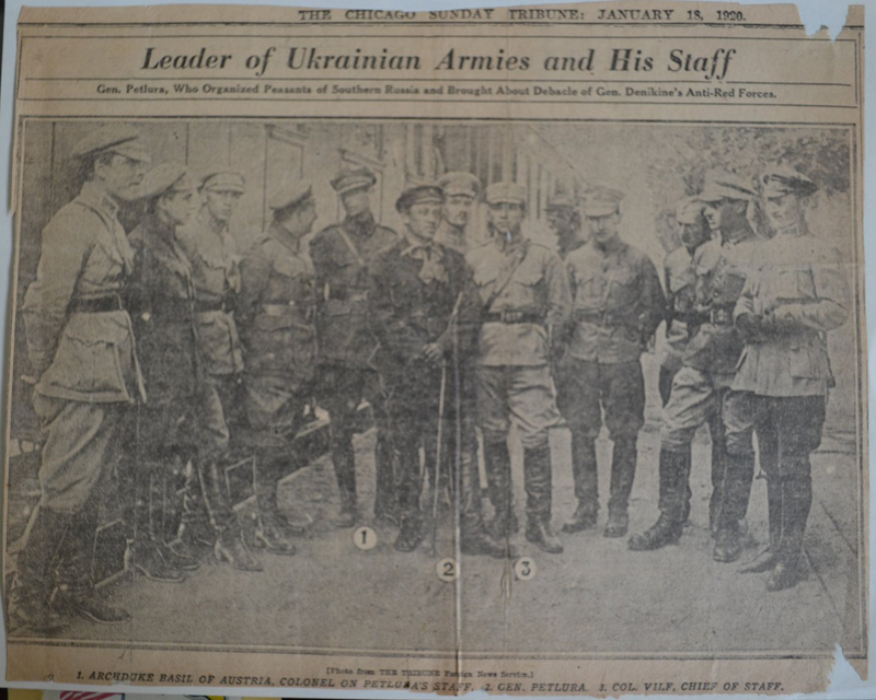 Відвідини Симоном Петлюрою бригади УСС, літо 1919 року. Зліва направ: перші три особи невідомі, Рубіш-Ляришенко (адьютант Вишиваного), В. Вишиваний, С. Петлюра, О. Букшований.