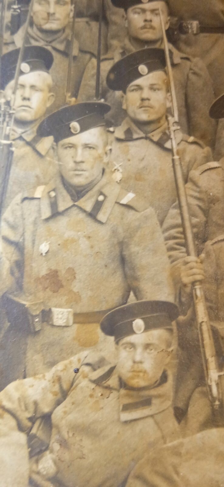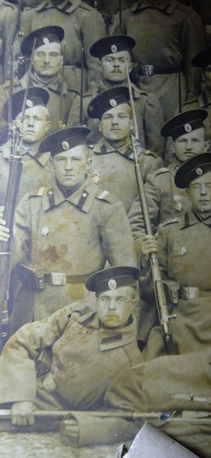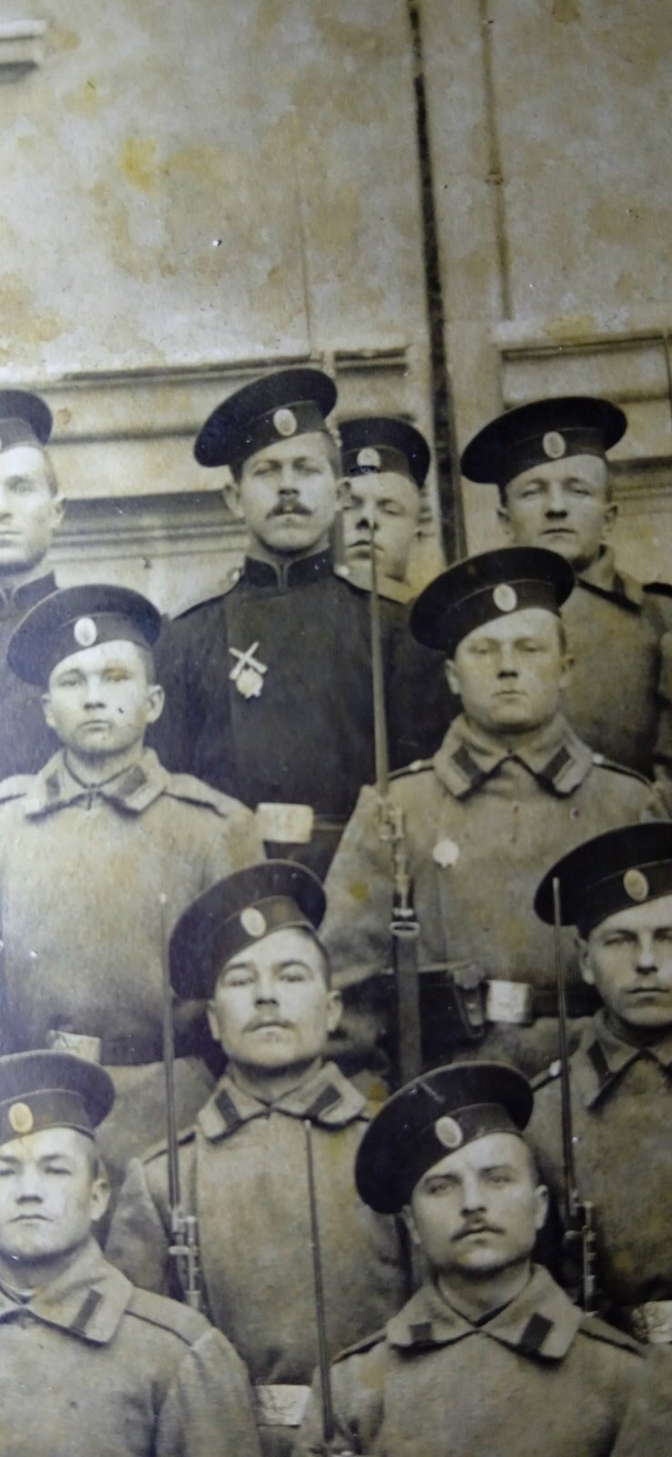 На свидетельстве есть имя Командира полка - полковник Крауз. https://ria1914.info/index.php/Крауз_Анатолий_Альдорович Полкового Адъютанта Штабс-капитана Топалова https://ria1914.info/index.php/Топалов_Михаил_Иванович Командира роты, Капитана Словецкого https://ria1914.info/index.php/Словецкий_Петр_Степанович Это действительно фото 1-го Стрелкового полка..Я принял красные погоны за синие...У одного персонажа, который без шинели, есть цифра 1 на погоне. По поводу двух из трёх оофицеров на фото... Есть фото этих двух офицеров в групповом фото офицеров полка, предположительно датированное 1912-м годом..На своём фото, обвёл обоих красным..Кстати видна та же призовая накладка на ножнах. Мне немного непонятна ситуация, при которой наш герой оказался в другом полку. На Вашем фото с двумя крестами - точно персрнаж из темы? На общем фото не могу определить его..Ое в чине старшего унтер-офицера(три нашивки на погоне), ну допустим на время съёмки был младшим унтер - офицером. На свидетельстве видится дата 1914 г.