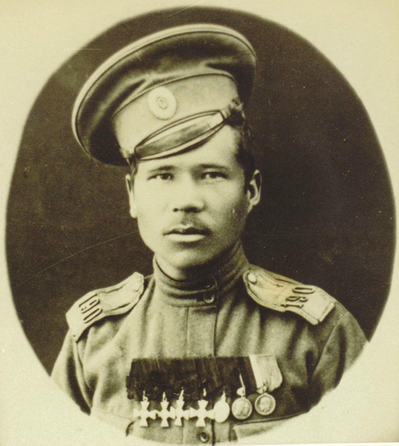 Офицеры и всадники 2-го Дагестанского конного полка Дикой дивизии с внуком Шамиля. В переднем ряду слева направо: Даниял Мавраев, Магомед Джафаров, член Всероссийского мусульманского совета Мухаммад-Захид Шамиль (внук имама), Арацхан Хаджи-Мурад, Ахмед Хан Аварский. Петроград. 31 августа 1917г.
