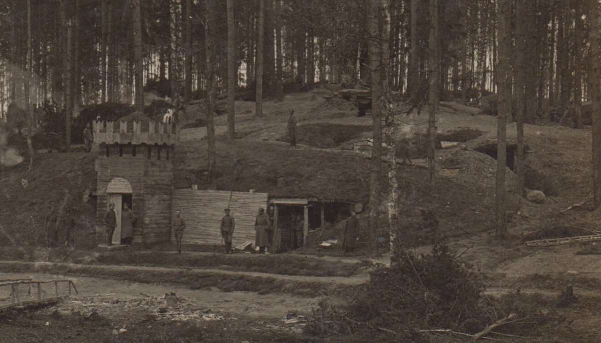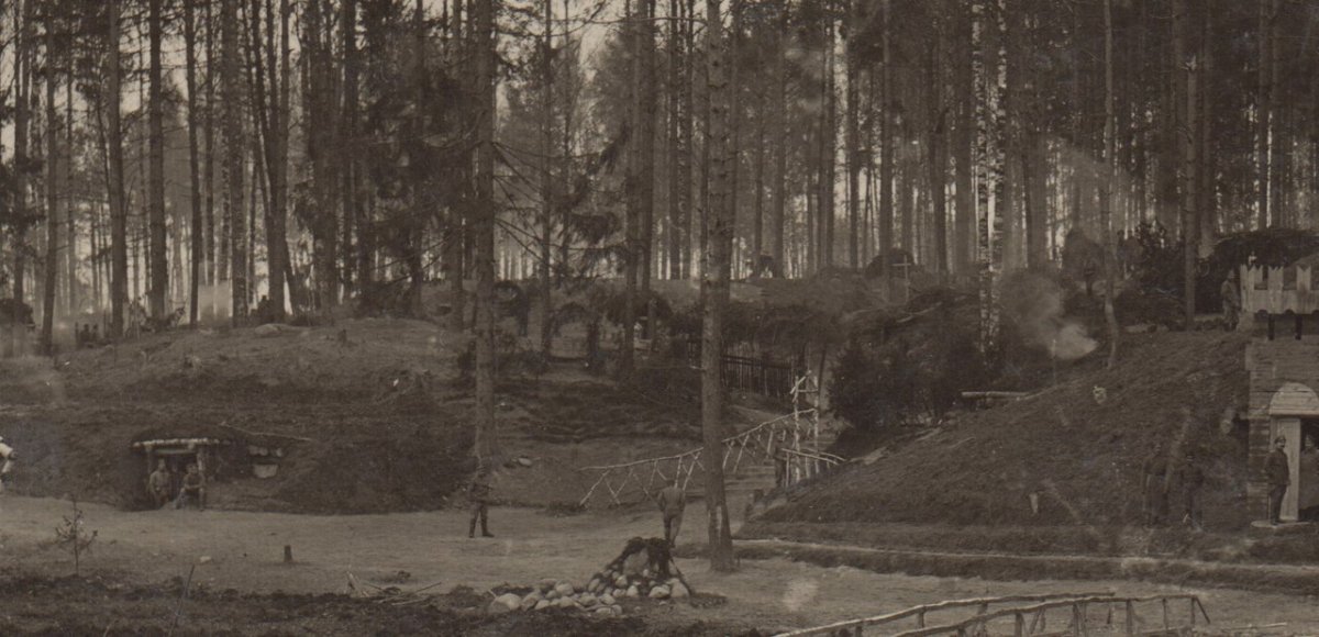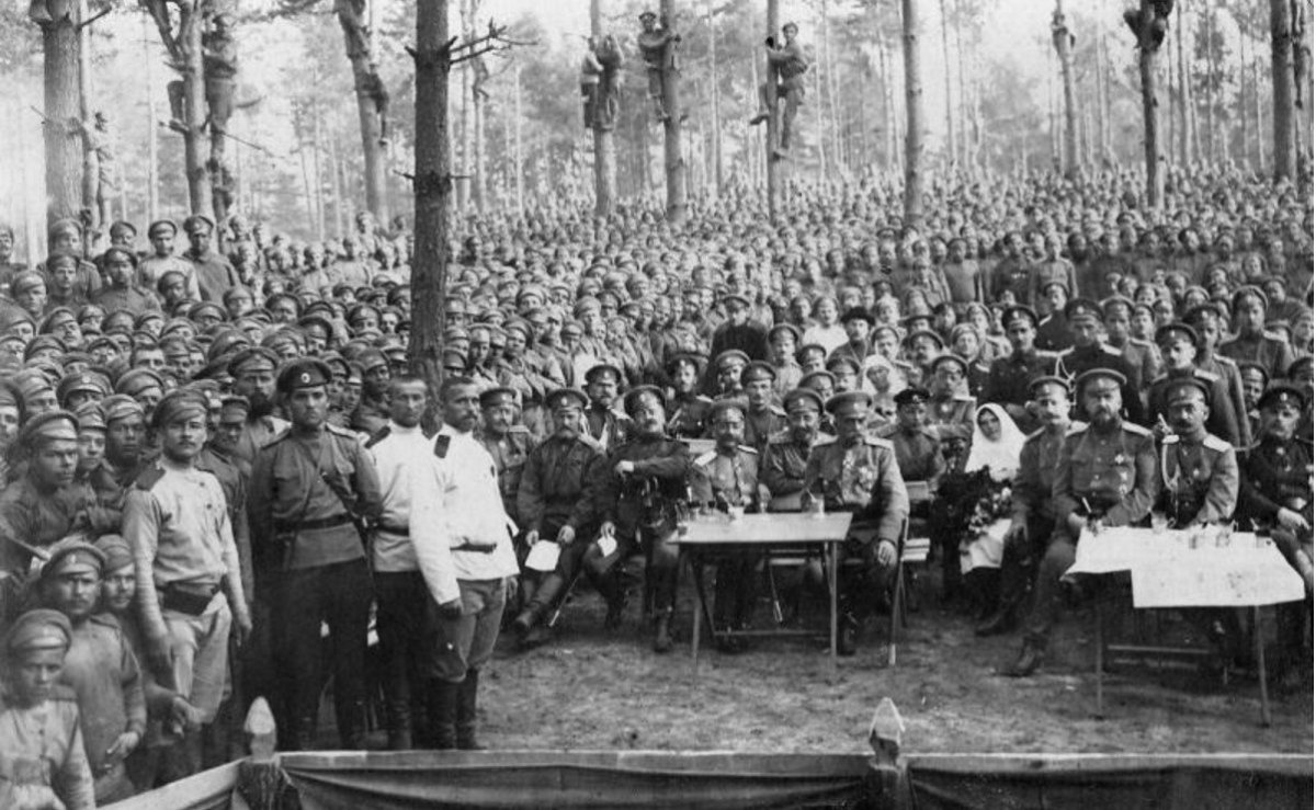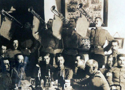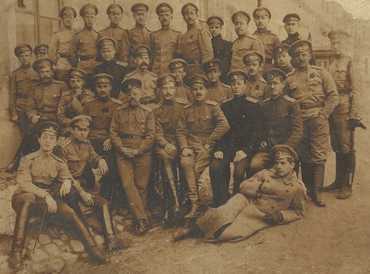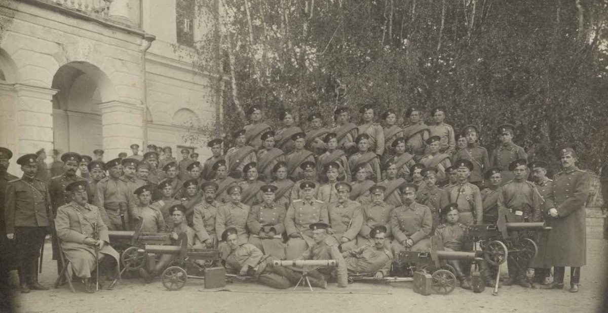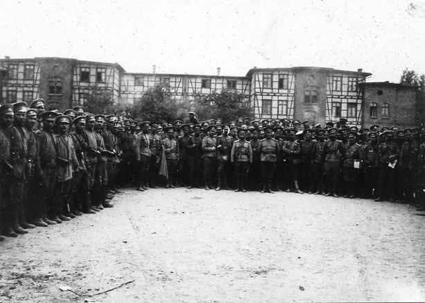 Чины 64-го пехотного Казанского полка с командиром полка полковником А.М.Ивановым (в центре) во дворе бывшей казармы немецкого 1-го Егерского батальона после взятия Ортельсбурга. 10.08.1914г.