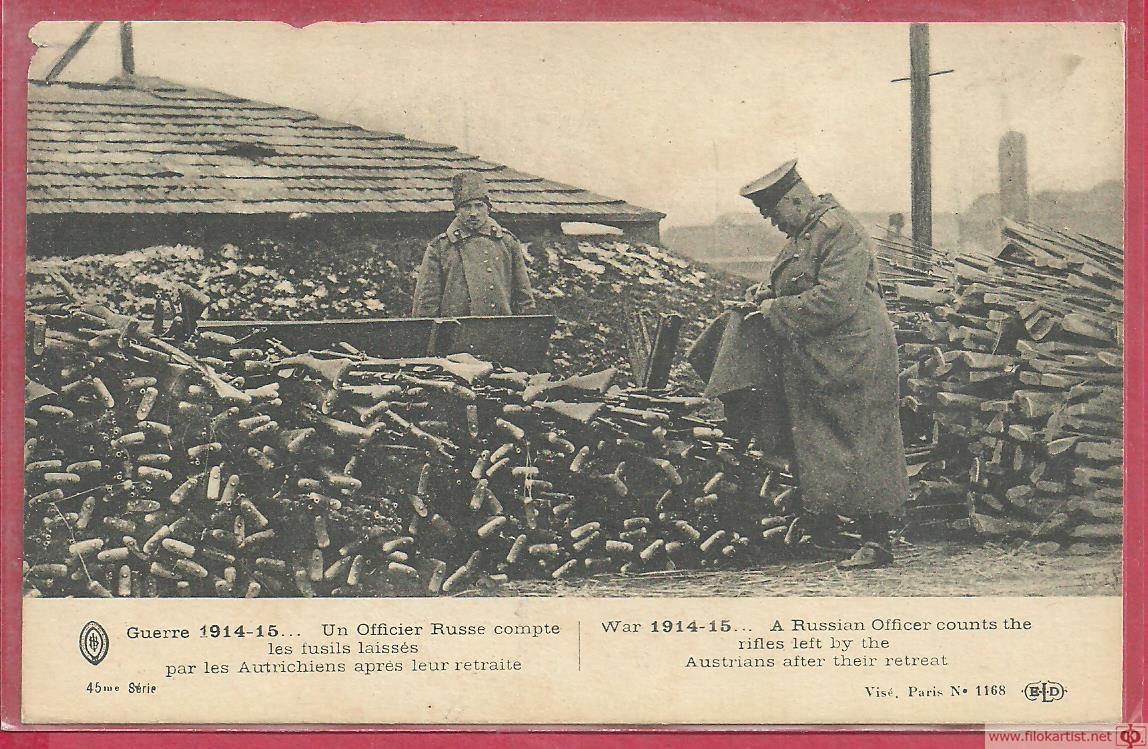 1. Прапорщик гвардейской артиллерии в вязаном шлеме. 2. Член команды зенитного орудия установленного на автомобильной тяге. 3. Ударник Частей Смерти. 4. Пулеметчик.