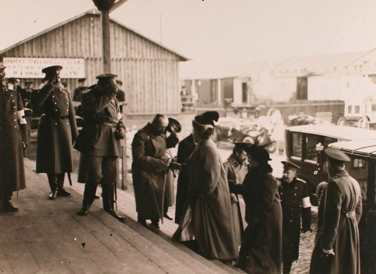 Военные чины встречают великих княгинь Анастасию Николаевну и Милицу Николаевну, прибывших для освящения подвижных питательных отрядов Красного Креста.