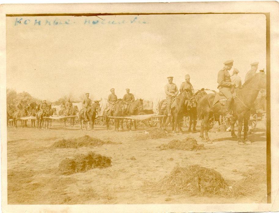 Чины Военно-Санитарного поезда №234, оборудованного Черниговским дворянством, с конными носилками во время выхода на позиции.