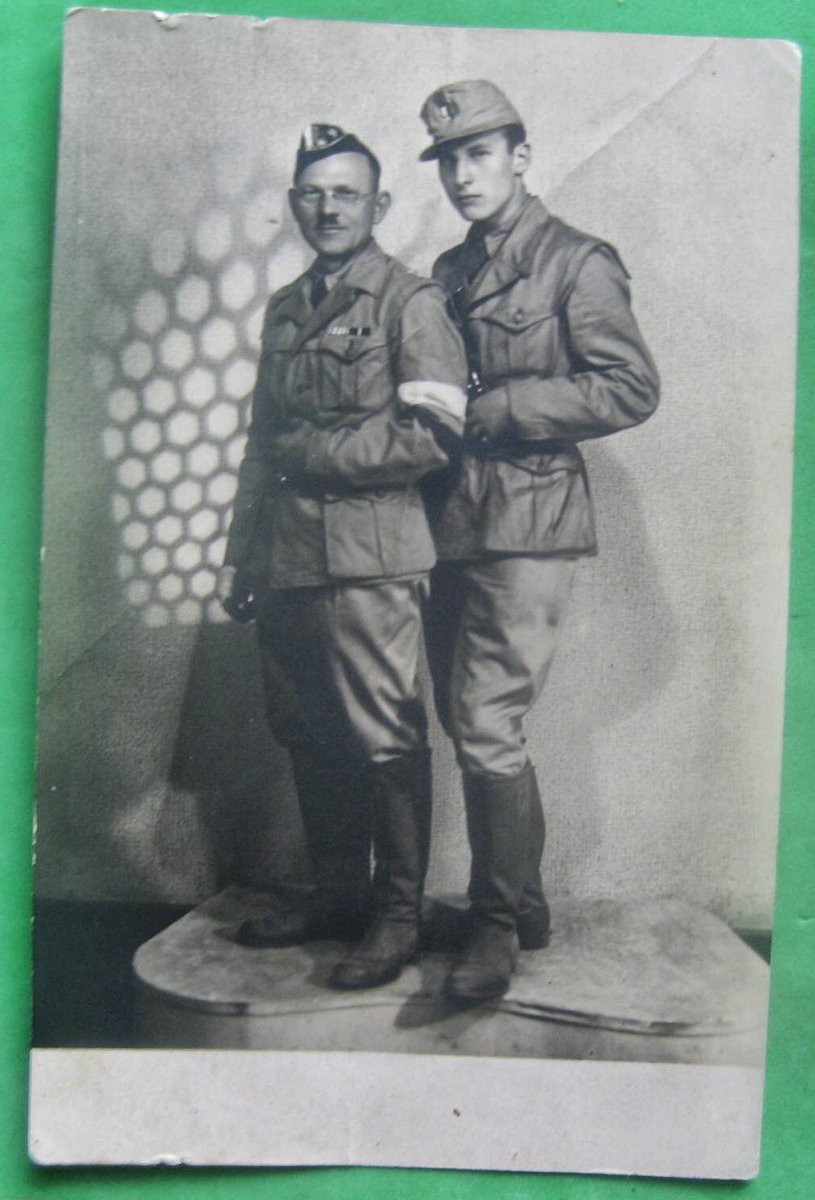 Приветствую. На фото люди в тропической форме СС "Sahariana", но без знаков различий. На человеке в очках - не известный для меня головной убор. На молодом парне кепи от того же тропического комплекта, но что за "обшива" установлена - то же не знаю. Дата на фото - июнь 45го, как я понял. Кто эти люди - не подскажу...