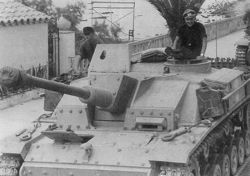 7.5 cm StuK 40 L/43 с шарообразным дульным тормозом встречались только на StuG III Ausf. F/8 в крайне небольшом количестве. Т.е. не на Ausf.F. Такие машины, судя по фото, встречались, как минимум в StuG.Abt.210. Вот фото из фронтовой иллюстрации в плохом качестве. На фото рубка вместе с орудием от Ausf.F/8 установлена на шасси от Ausf.F. Подразделение неизвестно.