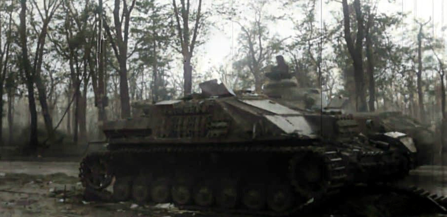 StuG III Ausf. B of Hauptmann Franke's 3. Batterie of Sturmgeschütz-Abteilung 244 roll into central Stalingrad. September 1942.