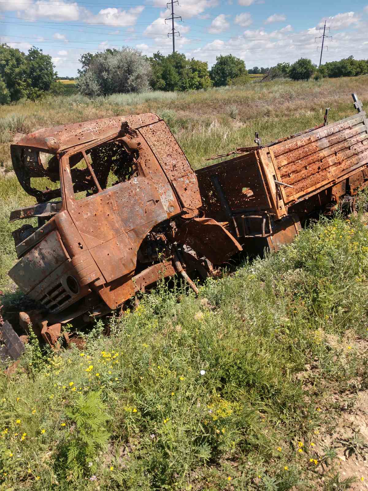 или это все паленое железо на одно лицо. или я его , этот камаз, видел вживую, своими глазами. смотрел на него и так не по себе немножко. танки-маталыги-хреньаналахав нет не так впечаьлили, там гордость берет. ну и военная железка так и должна сдохнуть от снаряда. а вот камаз? оно с гражданским как то ближе пересекается, поэтому наверное больше эмоций вызвало. как шот более знакомое в обычной жизни. сказать шо он решето? не, галимое сито, особенно со стороны пассажира если смотреть. так присматривался, не эксперт я, но пулевых 5.45 на морде всего штук 5-6 нашел, остальное осколками.
