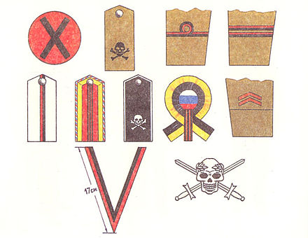 В Ударных частях на погонах череп с костями был у края и кант погона совершенно другой, у Корниловских частей на погонах череп с костями вверху ближе к погонной пуговице и кант более тонкий, фото различных Корниловских погон прилагаю, мой вариант обведен! Информация взята с Википедии, фото для сравнения