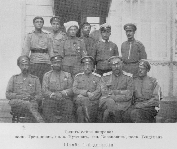 1.Генерал-майор Н.В. Скоблин(сидит справа),капитан Л.В. Копецкий,его адьютант(стоит посредине),полковник К.П. Гордиенко(стоит справа),1921 г. 2.Слева направо генерал Романовский, генерал Деникин, К.Н. Соколов. Стоят Н.И. Астров, Н.В. Савич.Лето 1919 года.Таганрог. 3.Штаб Первой пехотной дивизии перед началом Курской операции,август 1919 г. 4.Штаб Первой пехотной дивизии Добровольческой Армии,август 1919 г.