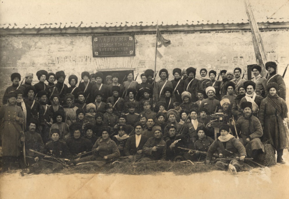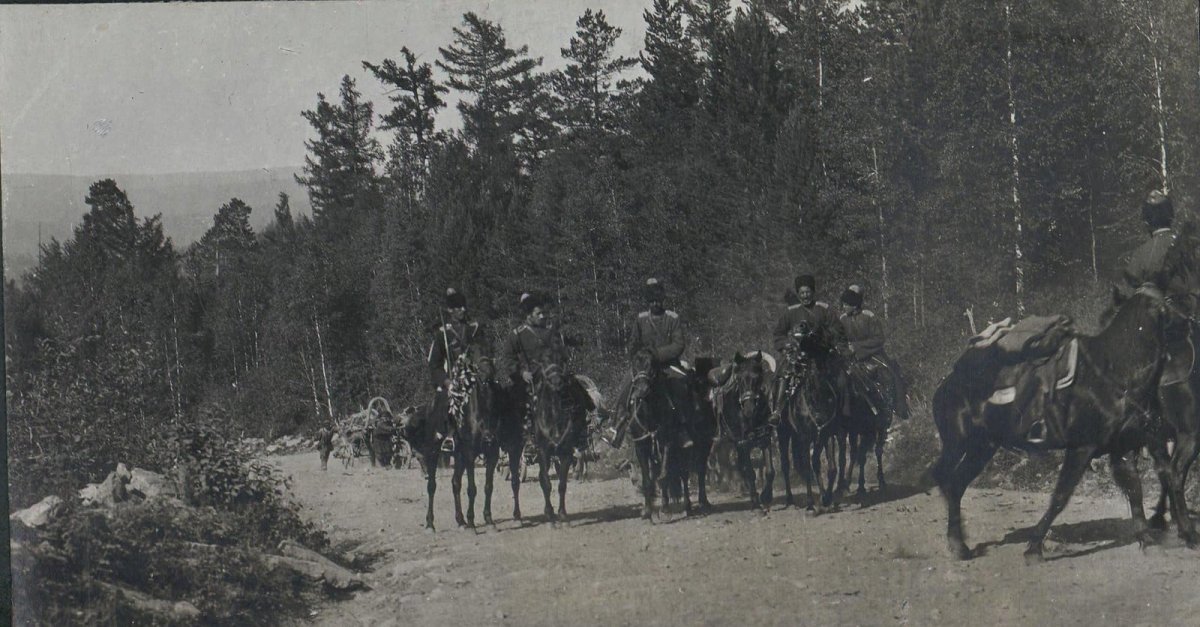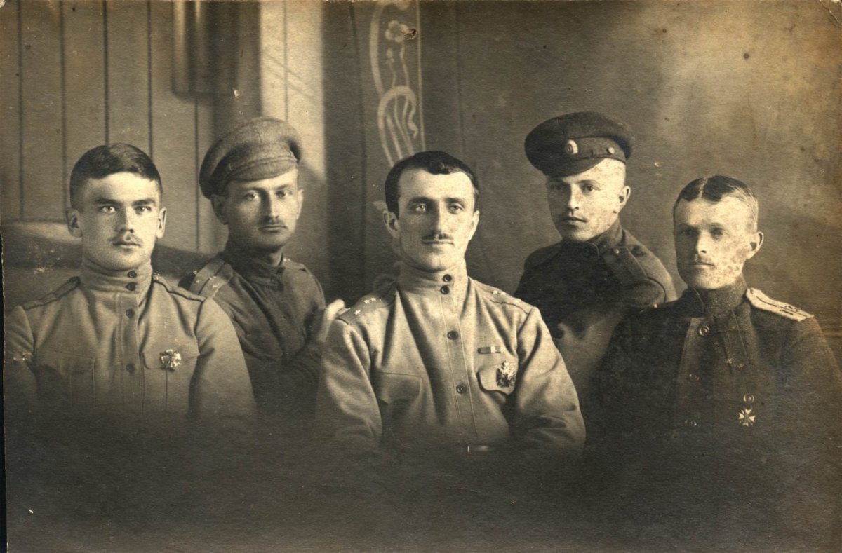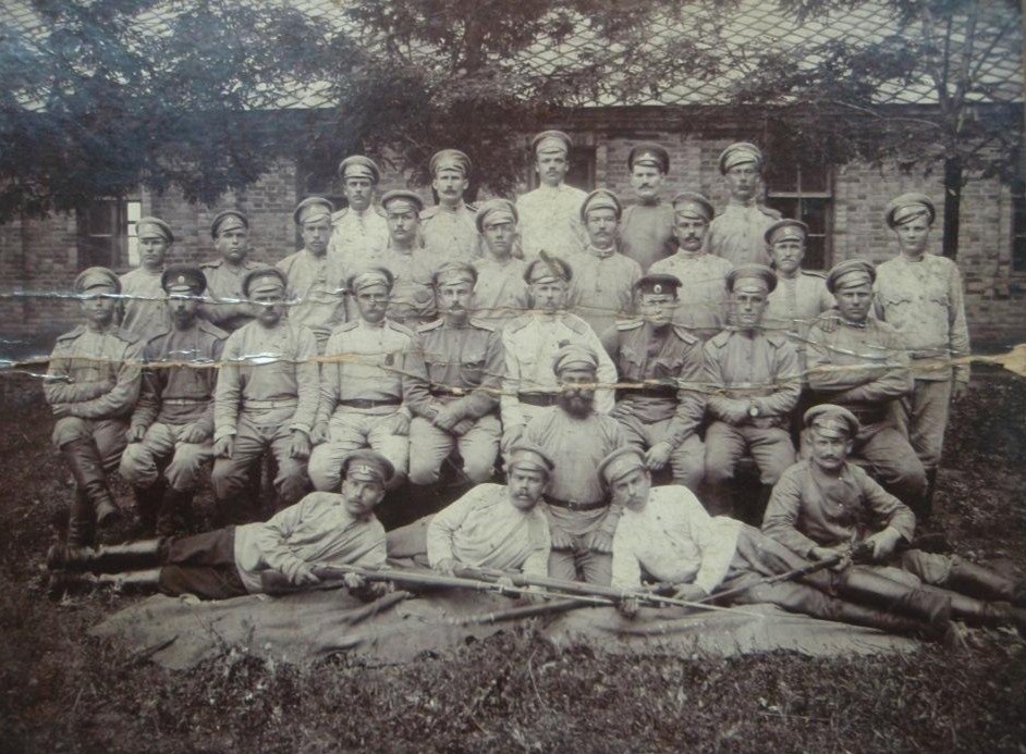 Группа чинов 13-го Уфимского стрелкового полка районе Уфы. В центре штабс-капитан Сидамонидзе Г.К. 1919 год. Личный архив полковника Г.К. Сидамонидзе.