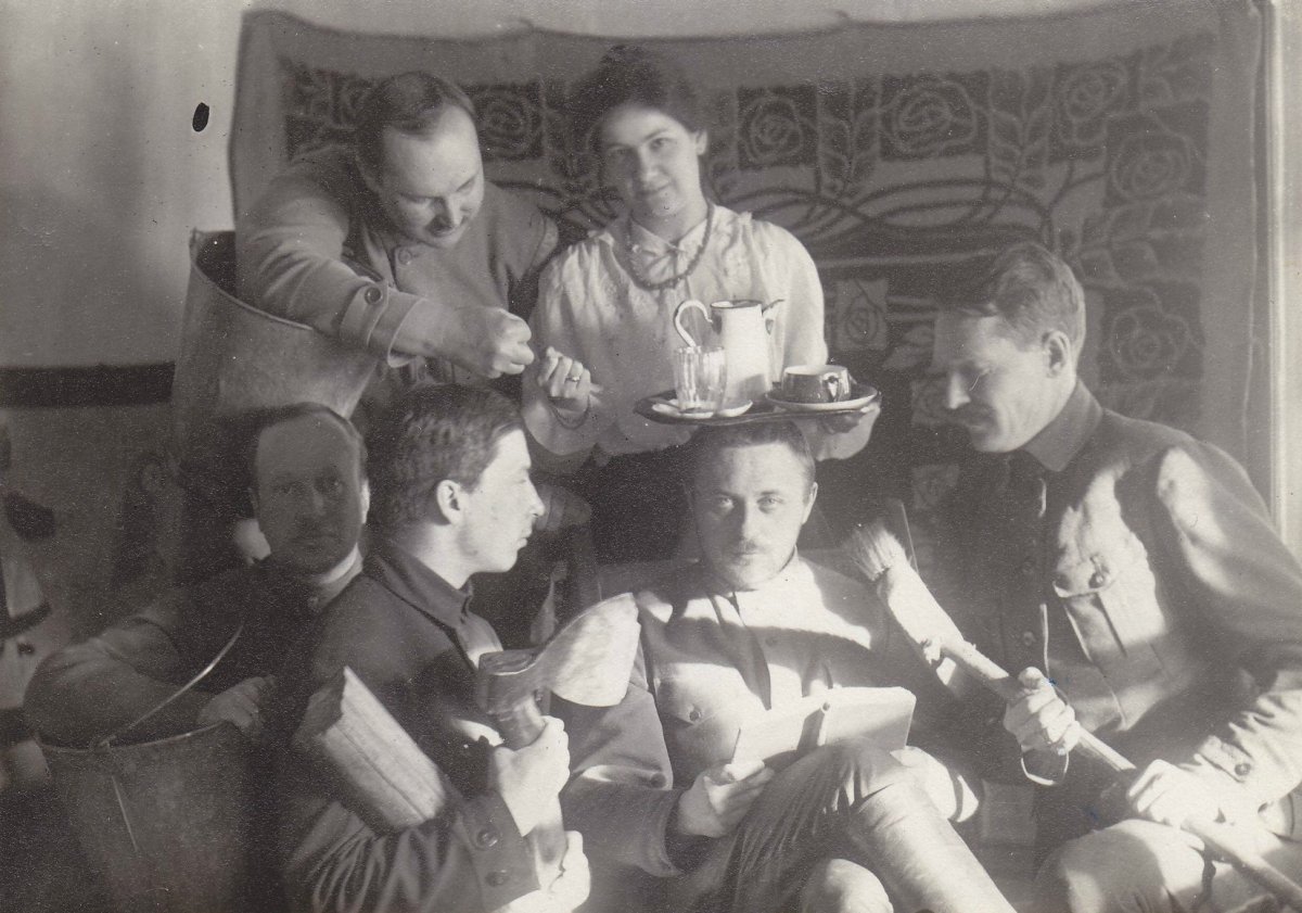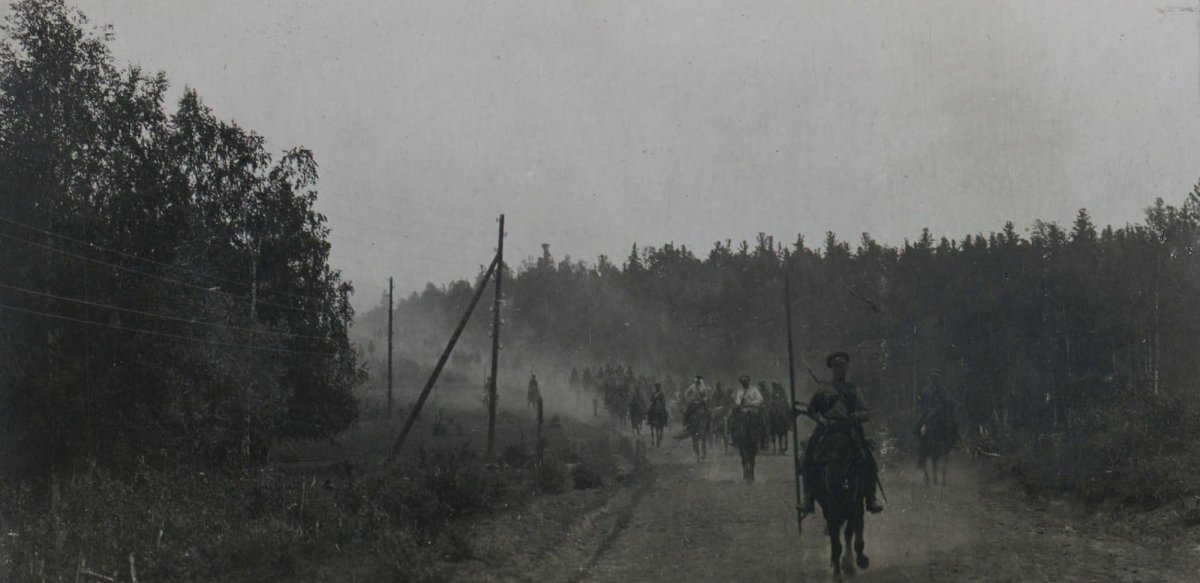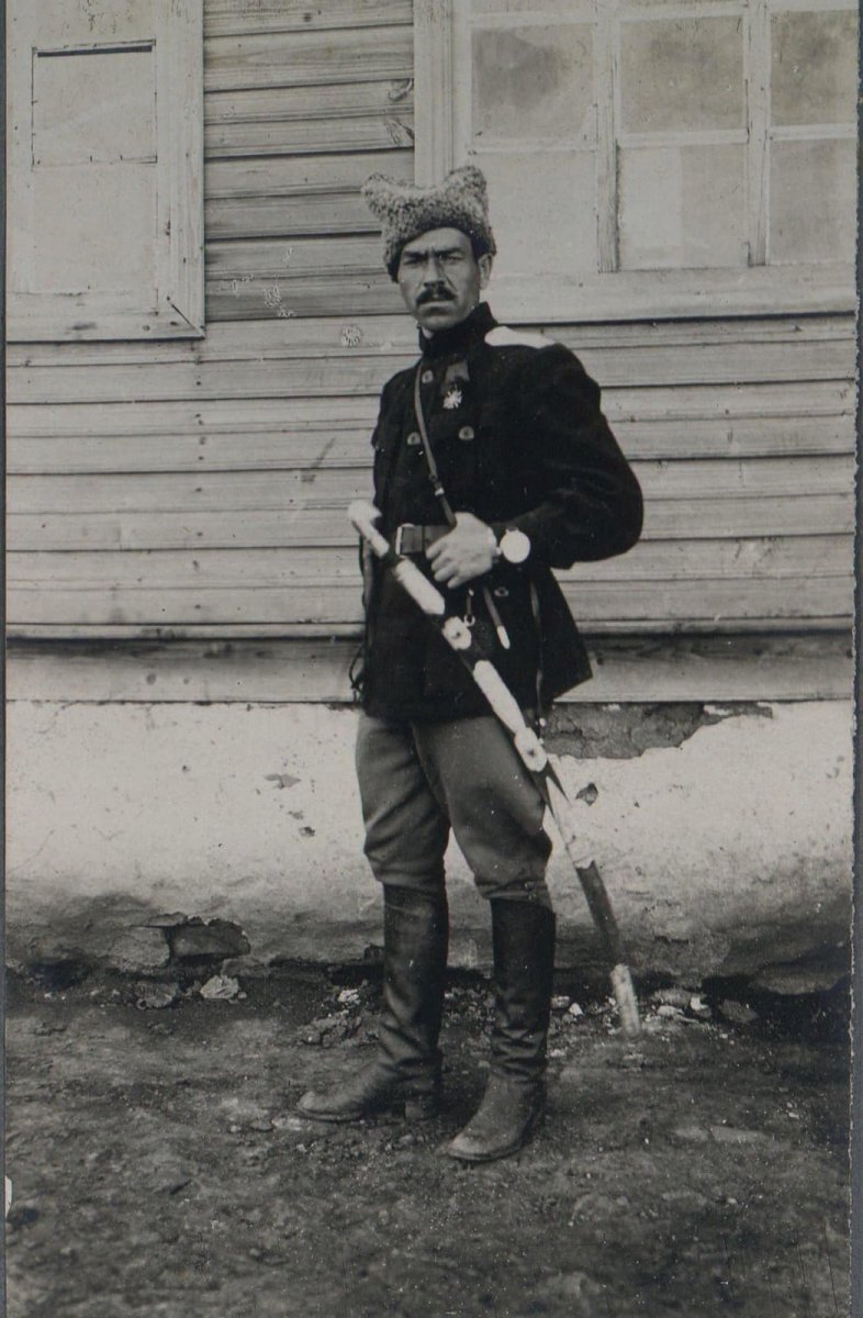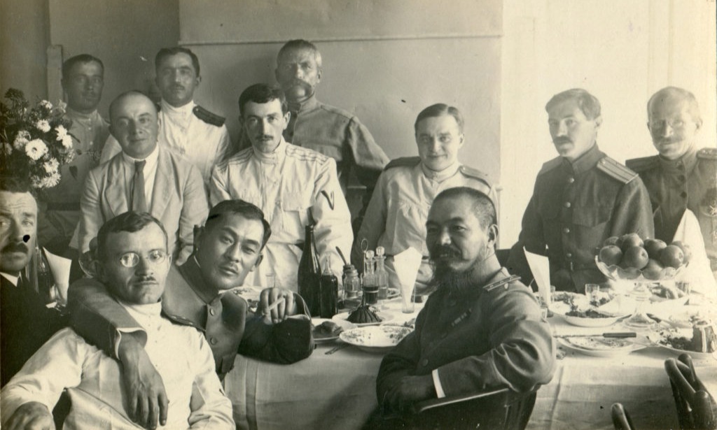 Группа чинов 13-го Уфимского стрелкового полка районе Уфы. В центре штабс-капитан Сидамонидзе Г.К. 1919 год. Личный архив полковника Г.К. Сидамонидзе.