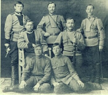 Казаки Оренбургского казачьего войска в форме войсковой милиции, созданной по приказу Войскового атамана Оренбургского казачьего войска А. И. Дутова в 1918 году. Начало созданию особой войсковой милиции положил отдел охраны войск, существовавший при штабе обороны Оренбургского казачьего войска. Все служащие войсковой милиции считались мобилизованными на действительную военную службу. К работе в милиции активно привлекалось местное, в том числе нерусское, население. Существовали отряды конной и пешей милиции, причём конная комплектовалась только казаками. Фото 1919г.