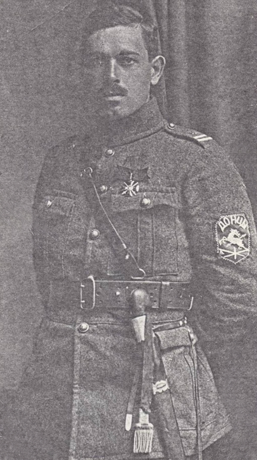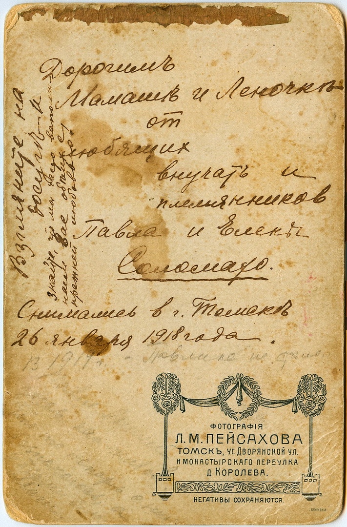 Белогвардеец Павел Соломахо. На обороте подпись: Дорогим Мамаше и Леночке от любящих внучат и племянников Павла и Елены Соломахо. Снимались в Томске 26 января 1918 года. Взгляните на досуге и знайте, что мы часто вспоминаем вас обеих с прежней любовью. И позже карандашная запись: В 1919 г. Павлика не стало...