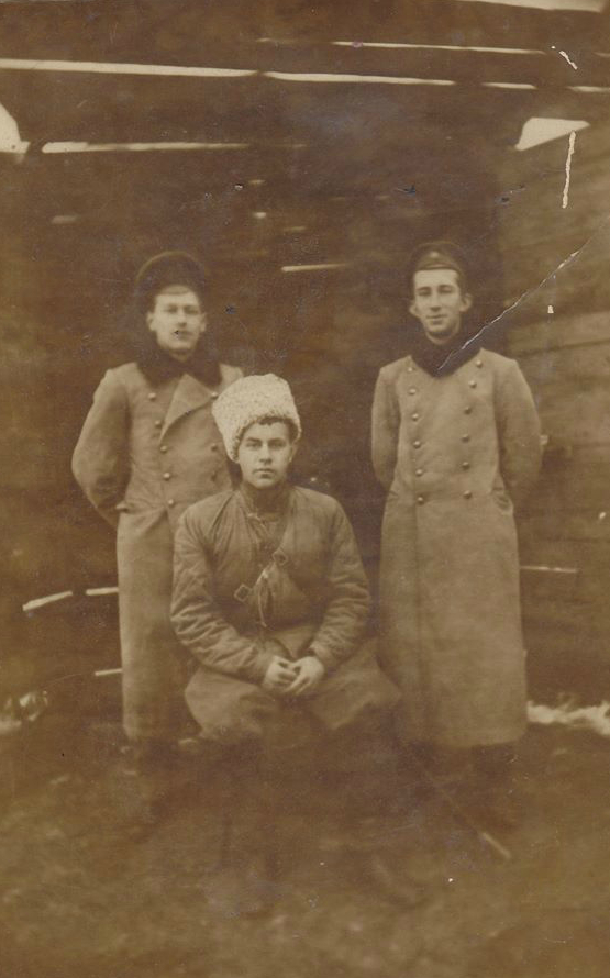 Поэт Николай Николаевич Туроверов в партизанском отряде Есаула Василия Чернецова. Позади два добровольца - гимназиста. Станица Каменская. Декабрь 1917г.