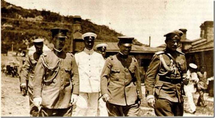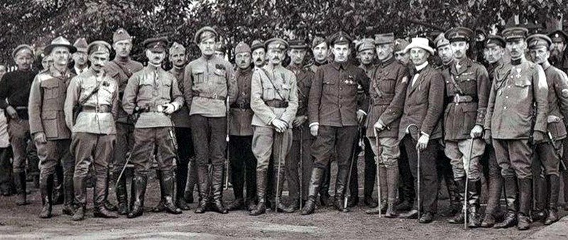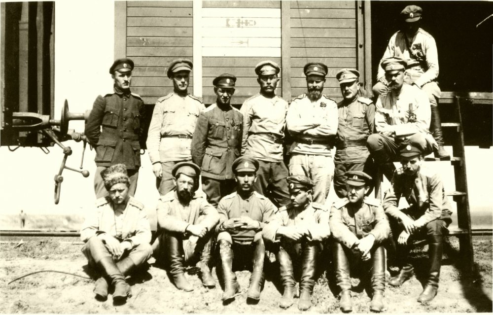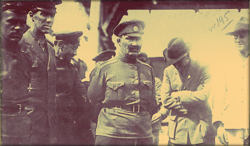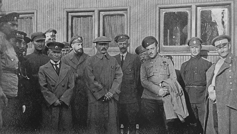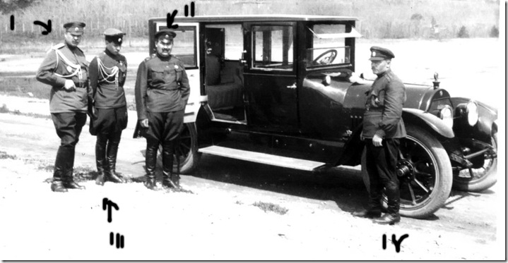 Отъезд генералов Дитерихса и Вержбицкого из Гирина (у вагона поезда). (апрель?) 1923г. Слева: ген.Ястребцов, в центре: ген. Вержбицкий, полк. фон Вах, ген. Дитерихс, ген. Молчанов. Снимок из книги В.М.Молчанов "Последний Белый Генерал"