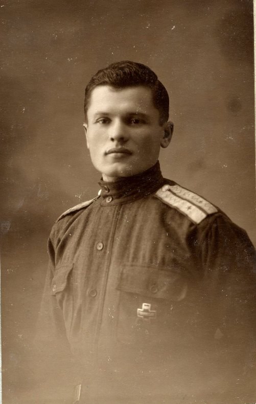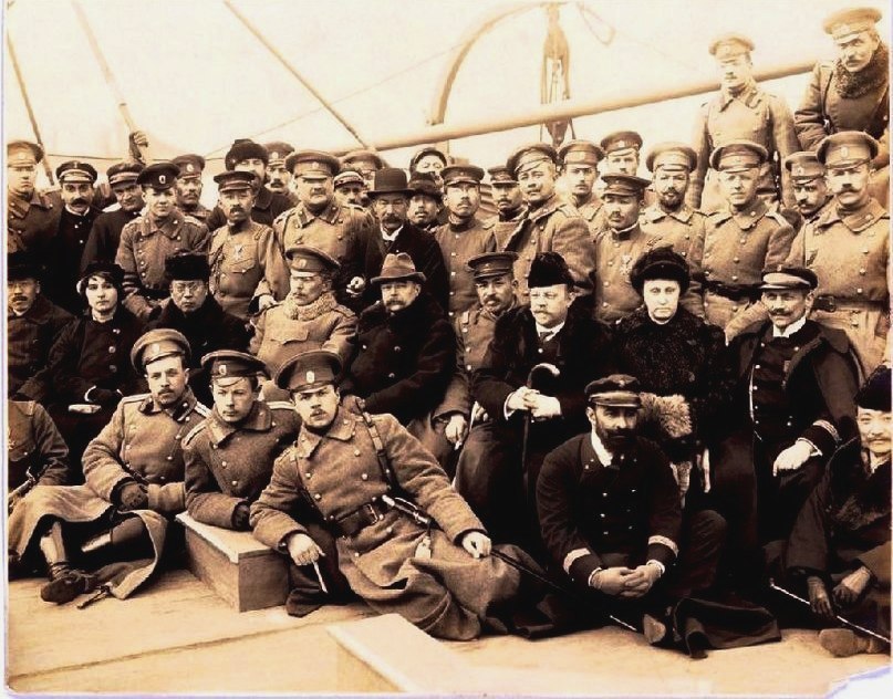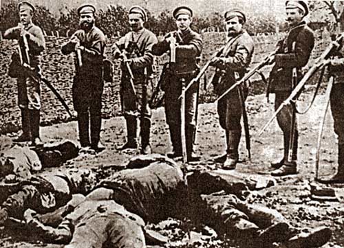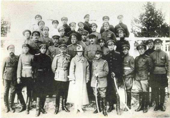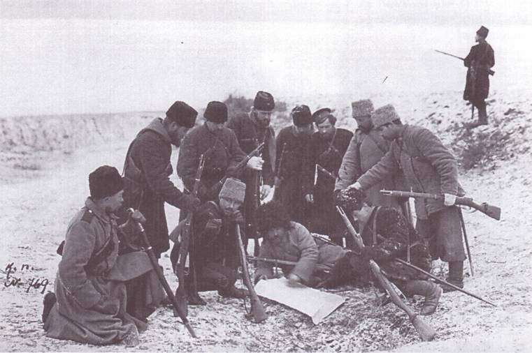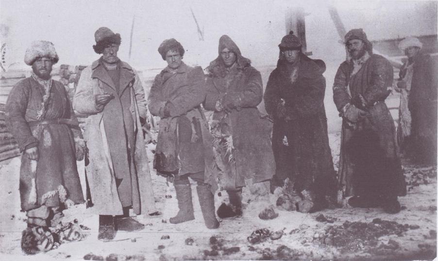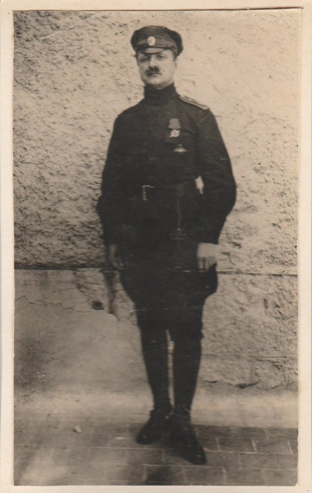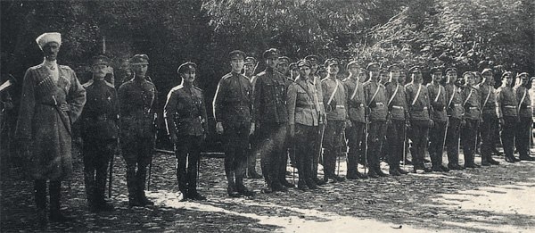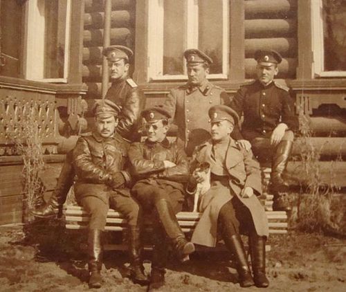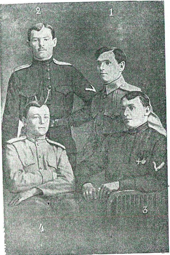 1 - «Младш. унт.-офицер из вольноопределяющихся» В. В. Макаров. 2 - Франчук - ординарц. 3 - Прокопов - ординарц. 4 - Понасенко - офицер конвоя.