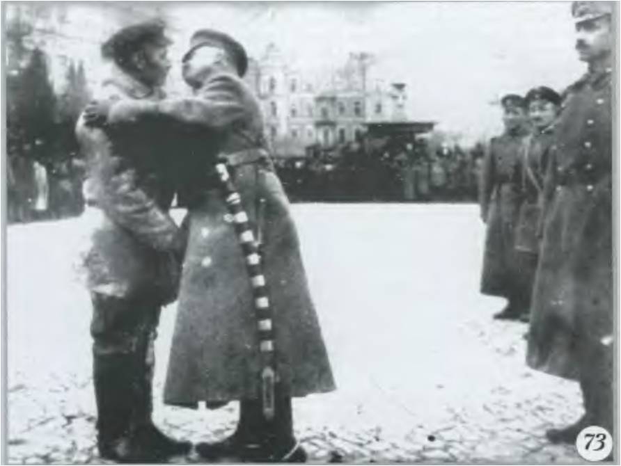 «Рабочие сделались хорошими солдатами и далеко превосходили своей доблестью многих казаков в боях», - вспоминал генерал А.Г.Шкуро про добровольно присоединившихся к белогвардейцам воронежских рабочих, стойко сражавшихся против большевиков. Боец 1-й рабоче-офицерской роты ВСЮР рабочий С.Кубелис был удостоен Знаком отличия Военного ордена IV степени за захват большевицкого пулемета в боях за Киев на Думской площади в октябре 1919 г. К чести нашего народа, не все представители рабочего класса соблазнились заманчивыми большевистскими лозунгами и достойно оказали отпор самозваной "рабоче-крестьянской власти", за маской которой скрывались банда инородцев, мечтающих уничтожить Россию, чекистский террор и диктатура самого кровавого режима в мире. На фото: 1. Боец 1-й рабоче-офицерской роты ВСЮР рабочий С.Кубелис. 2. Генерал Драгомиров поздравляет рабочего С.Кубелиса с награждением Георгиевским крестом.