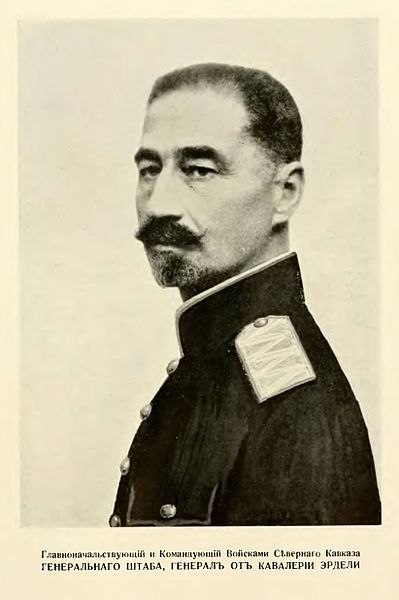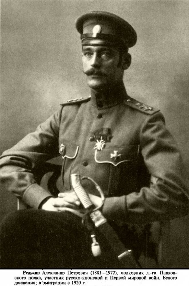 По правую руку от А.И. Деникина стоит полк. Шапрон Дю Ларре, одно время командовавший 2-м офицерским конным им. ген. М.Г. Дроздовского полком. Кстати - зять ген. Деникина. На приведенном мной фото Шапрон уже генерал, получивший чин фактически за командование конными дроздовцами. По левую руку от Деникина его бессменный начштаба ген. Романовский, впоследствии убитый в результате покушения.