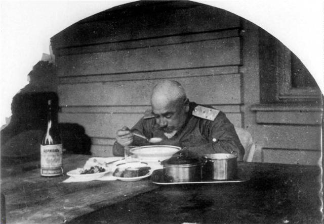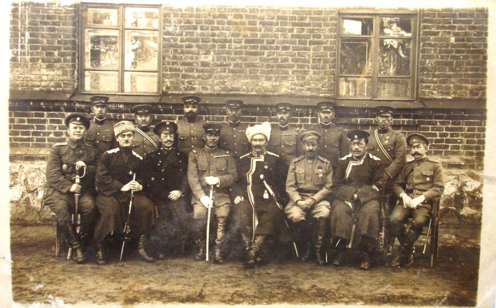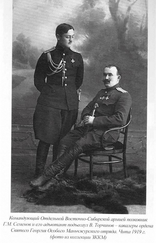 Атаман Семенов со штабом. 1919 год. Справа-налево: 1. NN, подполковник, начальник штаба дивизии А. В. Мисюры. 2. Левицкий Петр Петрович, генерал-майор, командир Отдельной Монголо-Бурятской им. Зорихто-Батора конной бригады. 3. Мисюра Андрей Викторович, генерал-майор, командующий дивизией. 4. Семенов Григорий Михайлович, походный атаман Дальневосточных казачьих войск, генерал-лейтенант. 5. Огата, генерал-майор, командир бригады 5-й японской дивизии. 6. NN, личный доктор атамана Семенова. 7. Турчин, есаул, адъютант атамана Семенова. 8. NN, полковник.