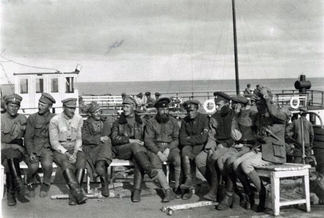 В центре фото, сделанного перед Посольской операцией на палубе парохода "Бурят" запечатлен подполковник Б.Ф. Ушаков (02.05.1889 - 17.08.1918) - он сидит в кожаной куртке, закинув ногу на ногу. Через пару дней будет убит в бою, а его его Посольский десант пробьет-таки дорогу к Семеновцам.