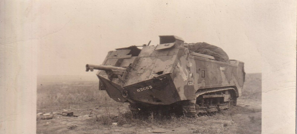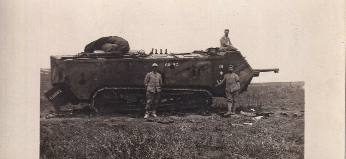 California Soldiers with Tank. Location not confirmed. c. 1919. Photographer: H. J. Mathews, Weed, California.