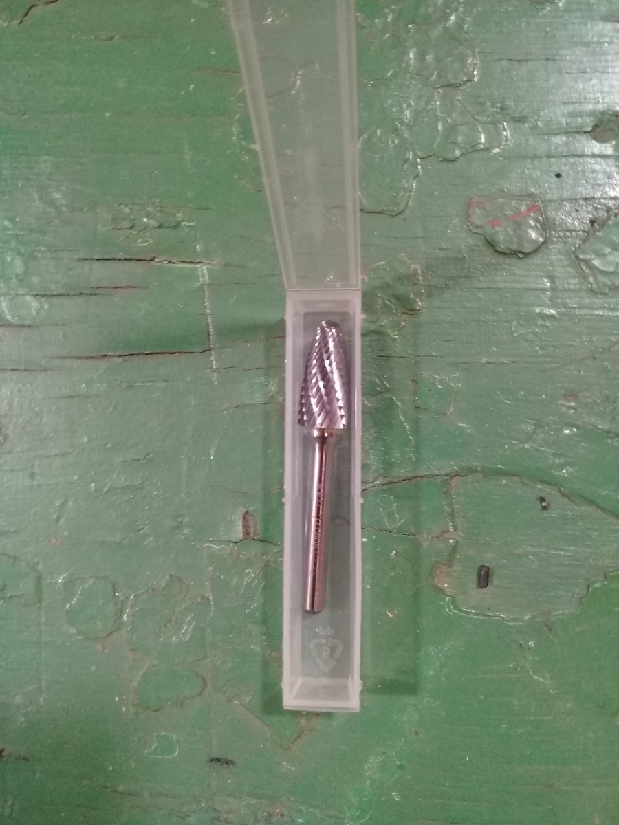 З твердосплаву типу "Побідітова", вставляється в дрємєль, (електричну бормашинку з гнучким шлангом?)