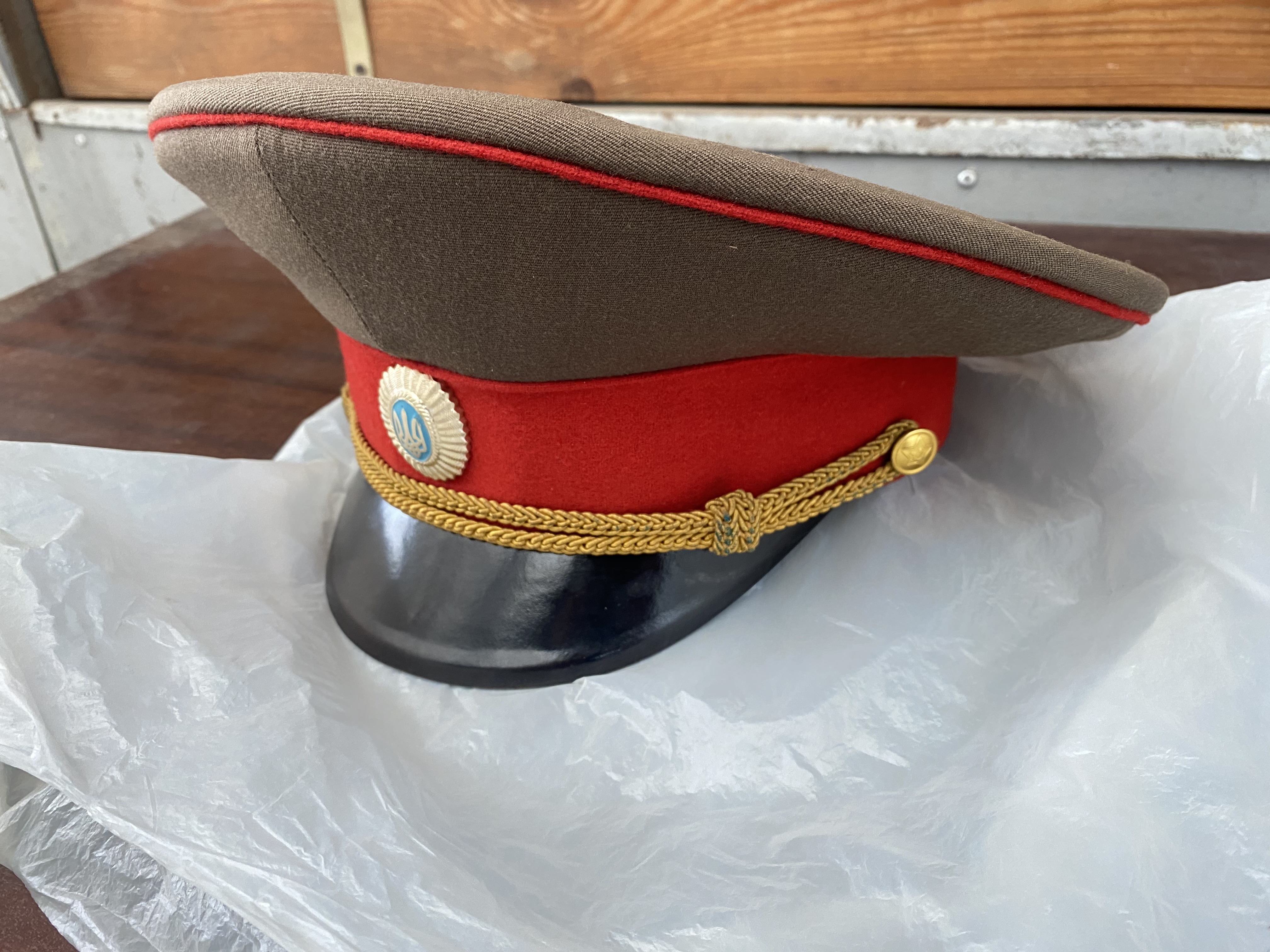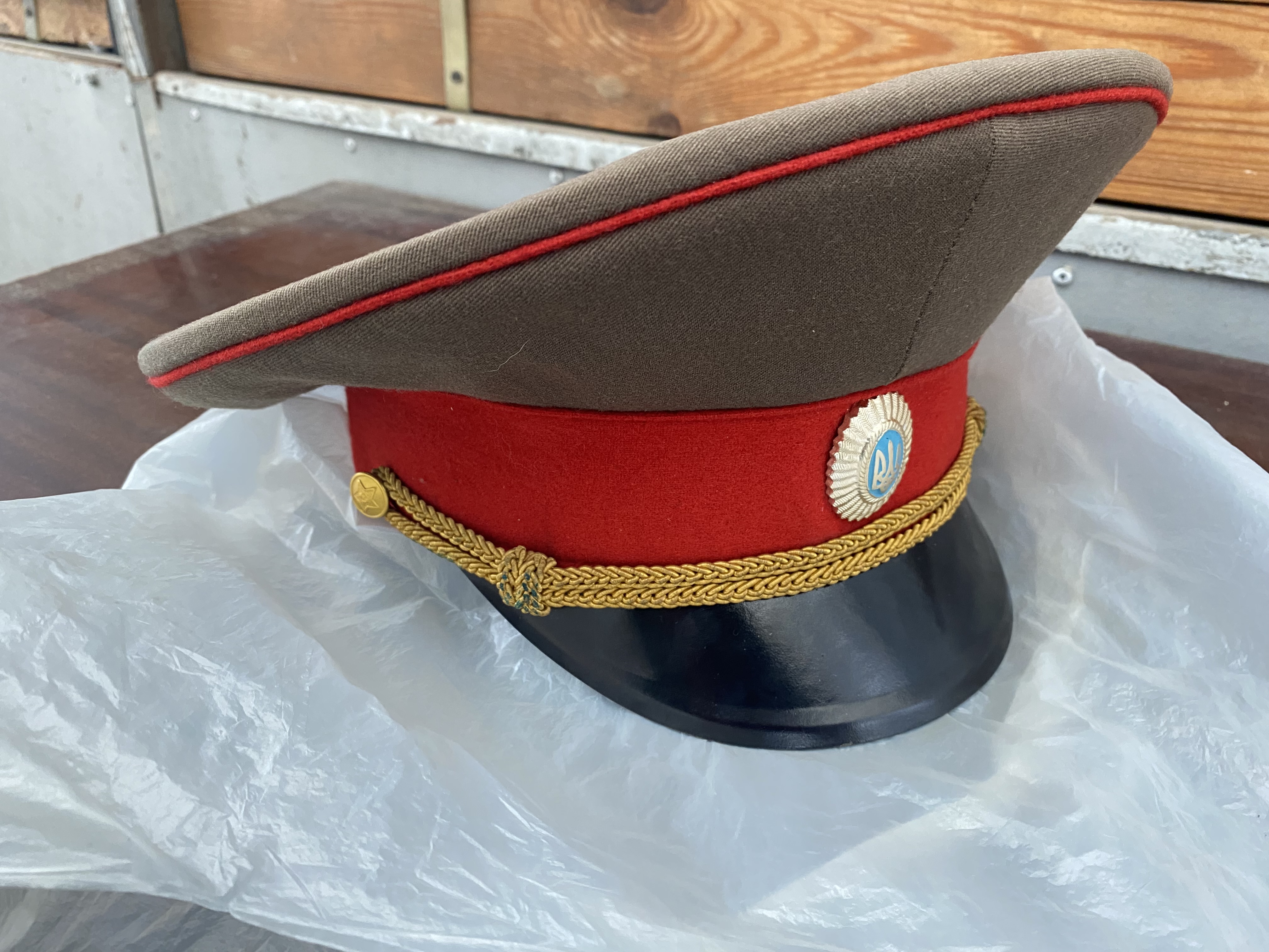 Доброго! Офіцерська фуражка, кінець совка - перші роки незалежності (приблизно до 1996-97 рр). Індивідуальний пошив, в Києві такі шили в ательє МО на Повітряфлотському. Замовляли усі, від полковників до лейтенантів-випускників. Із пластиковим козирком було трохи дешевше, із глянцевим шкіряним дорожче, і по сукну відповідно теж була різниця в ціні. В Одесі також шили, трохи крій відрізнявся, але несуттєво. По Вашій не візьмусь судити, де зроблена. З повагою,
