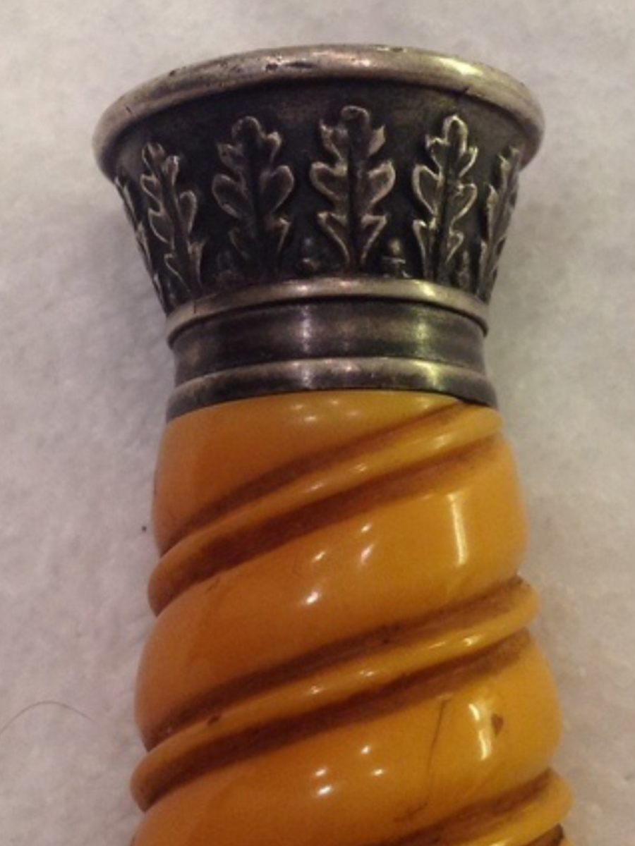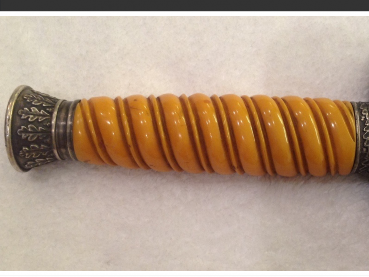 Но если Вы хотите установить подлинность рукояти, а не теперешнюю работу то я бы ещё посмотрел на отверстие в рукояти. Наверняка для сравнения в книгах или каталогах есть примеры.
