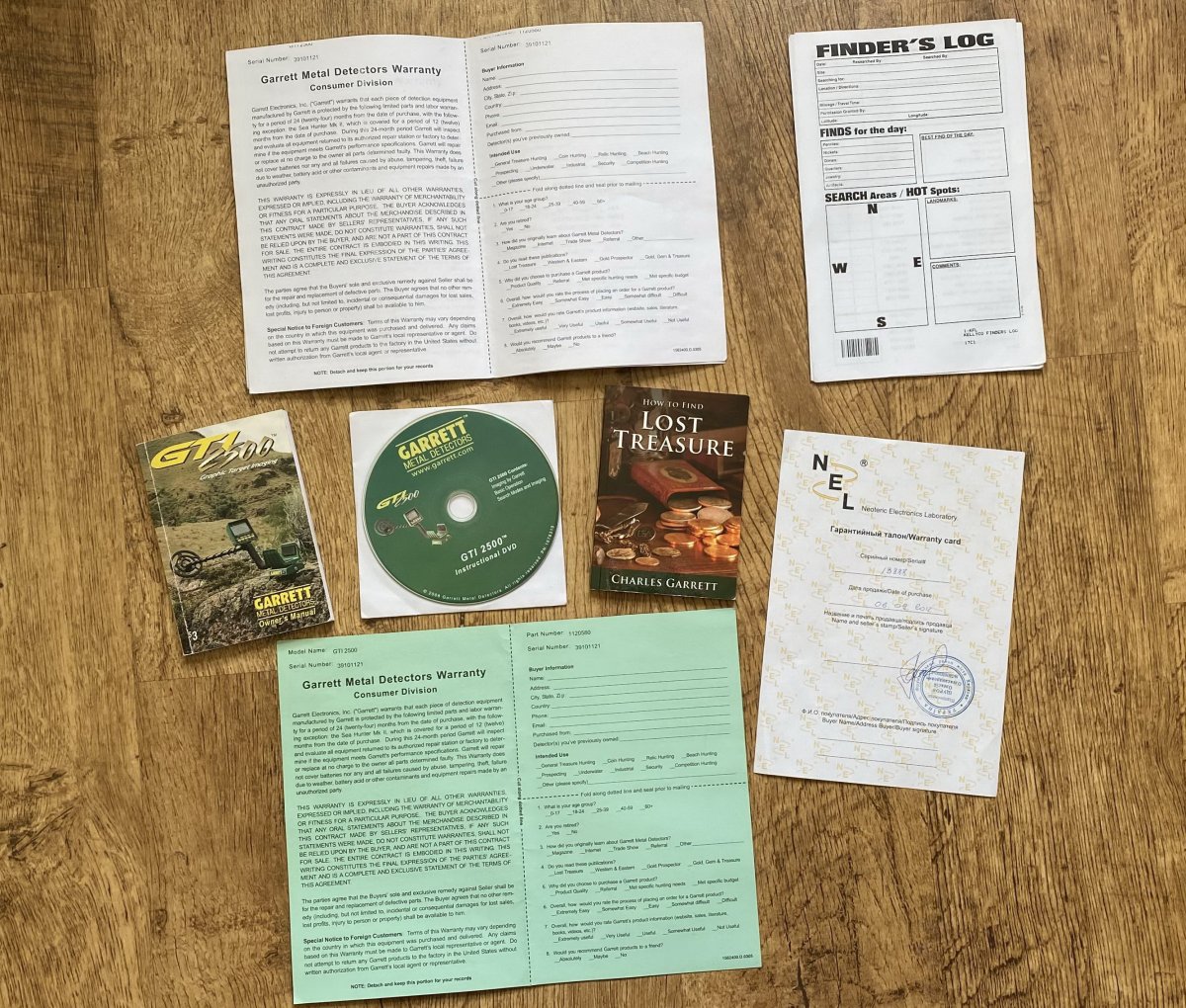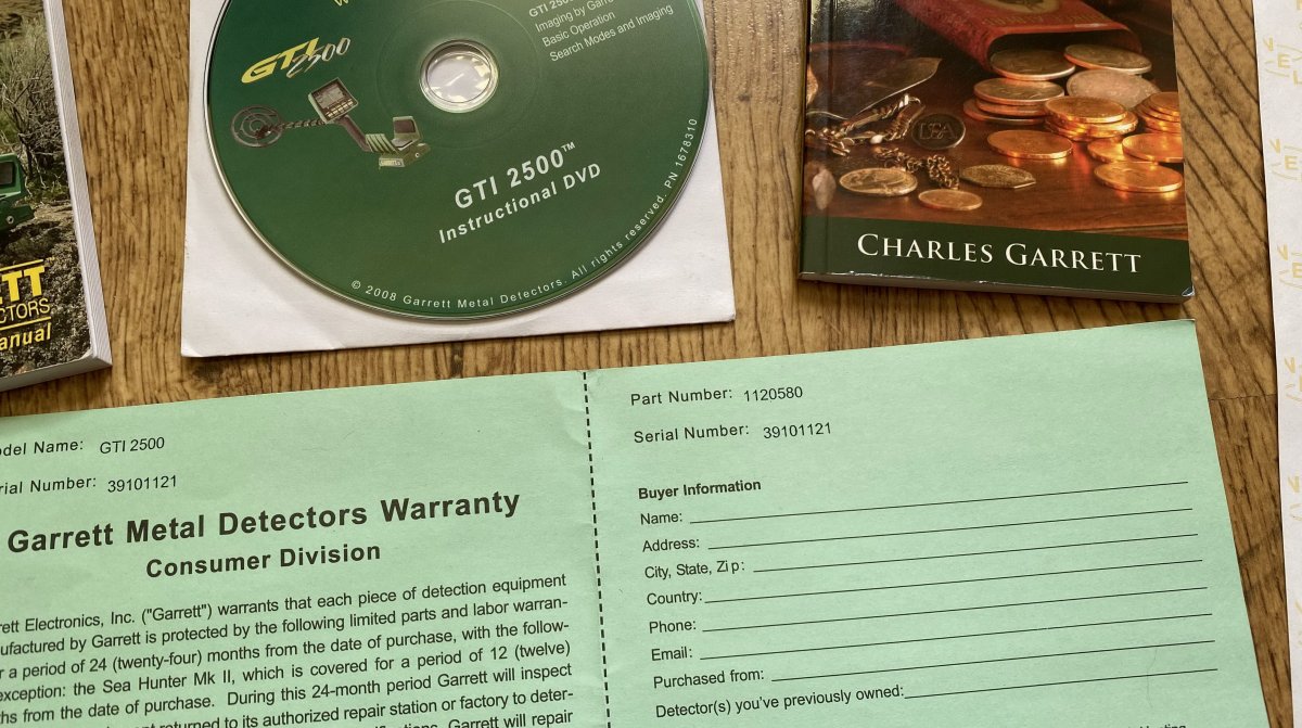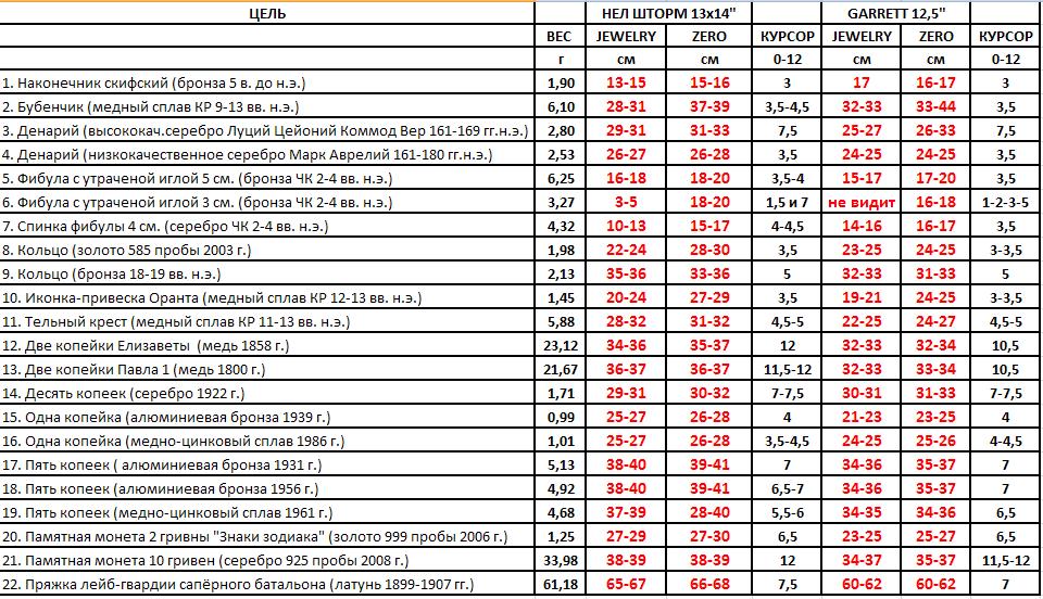 Серийный номер прибора 39101121. Документы на металлодетектор и катушку NEL Storm: Технические характеристики металлодетектора Garrett GTI 2500: Производитель: Garrett (США) Модель: GTI 2500 Год: 1999 Тип: Грунтовый металлоискатель Экран (Дисплей): Есть Электронная схема: VLF (Very Low Frequency) Количество частот: 1 Частота: 7,2 кГц Программы для поиска, количество: 5 (4 заводские+1 пользовательская). Режимы работы: "Все Металлы", "Монеты", "Ювелирные Изделия", "Реликвии", "Без Дискриминации", "Пользовательский" Статический режим: Есть, полноценная функция "Все Металлы" - на ней прибор работает на максимальной глубине VDI/TargetID: ВДИ нет, используется технологии: Graphic Target Imaging - измерение размера и глубины залегания металла и Graphic Target Analyzer - курсор графической шкалы Target ID позволяет определить тип обнаруженного металла (железо, серебро, золото), 24 сегмента шкалы Баланс грунта, ручной: Есть Баланс грунта, авто: Есть Функция ScanTrack обеспечивает GTI 2500 автоматическую адаптацию под стиль работы оператора и условия грунта Функция устранение влияния соли: Есть Отстройка помех / Сдвиг частоты: Нет / есть Звук, количество тонов: 4 тона Регулировка громкости: Есть Режим пинпоинт: Есть Регулировка порогового фона: Есть Регулировка чувствительности: Есть, 24 уровня Разъем для наушников: Есть, разъём 1/4 дюйма (6.3mm) большой Jack Подсветка: Есть Оригинальная катушка: Моно катушка Garrett 9,5" PROformance Imaging, диаметр 24 см Параметры Регулируемый размер: 101-129 см Питание: 8 штук батареек/аккумуляторов типоразмера AA Вес в собранном виде: 2,1 кг Потратил несколько часов, что бы найти в сети вес прибора, сумки, наушников, глубинной рамки и катушек. Нифига нема, нигде, вроде как специально зашифровали Итак, вес прибора и катушек на кухонных электронных весах, походу такая информация всплывает впервые: - Блок прибора с верхней штангой, без чехла и аккумуляторов: 1258 г - Средняя и нижняя штанга с крепёжным болтом: 161 г - Защитный чехол на блок: 71 г - 8 штук заряженных аккумуляторов Ansmann Digital 2850 mAh: 235 г - Наушники Garrett Master Sound: 414 г - Сумка для транспортировки Garrett Supreme Carry Bag: 1895 г - Катушка моно Garrett 9,5" PROformance Imaging, диаметр 24 см с защитой: 638 г - Катушка DD Garrett 12,5" PROformance Imaging, диаметр 32 см с защитой: 967 г - Катушка DD NEL Storm 13"x14", диаметр 33x36 см с защитой: 852 г - Глубинная рамка Garrett Treasure Hound with EagleEye Depth Multiplier: Передняя катушка (TX) 1229 г, задняя катушка (RX) 738 г, штанга с набором крепежа 1015 г. Итого, минимальный вес прибора с аккумуляторами, катушкой 9,5", без чехла на блок и без наушников составит приблизительно 2292 грамма. С катушкой 12,5" - 2621 грамма. С катушкой NEL Storm - 2506 грамм. Глубинная рамка весит приблизительно 2982 грамма, полный вес с блоком, защитным чехлом, наушниками и аккумуляторами составляет приблизительно 4960 грамм. Краткие полевые тесты прибора с катушкой DD NEL Storm 13"x14". Настройки - стандартные (по умолчанию), чувствительность - максимум, режимы - "Ювелирка" и "Зеро", перезагрузка при смене каждой катушки, тесты по воздуху в сантиметрах: Результат оформил в таблице: Отличный прибор по войне, не смотря на его годы. В статическом режиме "Все Металлы", на максимальной чуйке, в наушниках и с правильно отрегулированным пороговым фоном он творит чудеса...