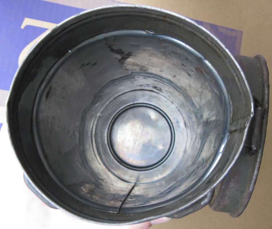 Здравствуйте. Подскажите стоимость такого бака. На крышке есть небольшая вмятина (широкая, но неглубокая - обвёл красным на одном фото); профиль цилиндра к верху принимает овальную форму - но крышку можно захопнуть; дыр нету (правда, щель между крышкой и цилиндром не очень герметична). На пепельнице указано 1940г(если надо выложу фото крупнее); пепельница нормально закрывается.